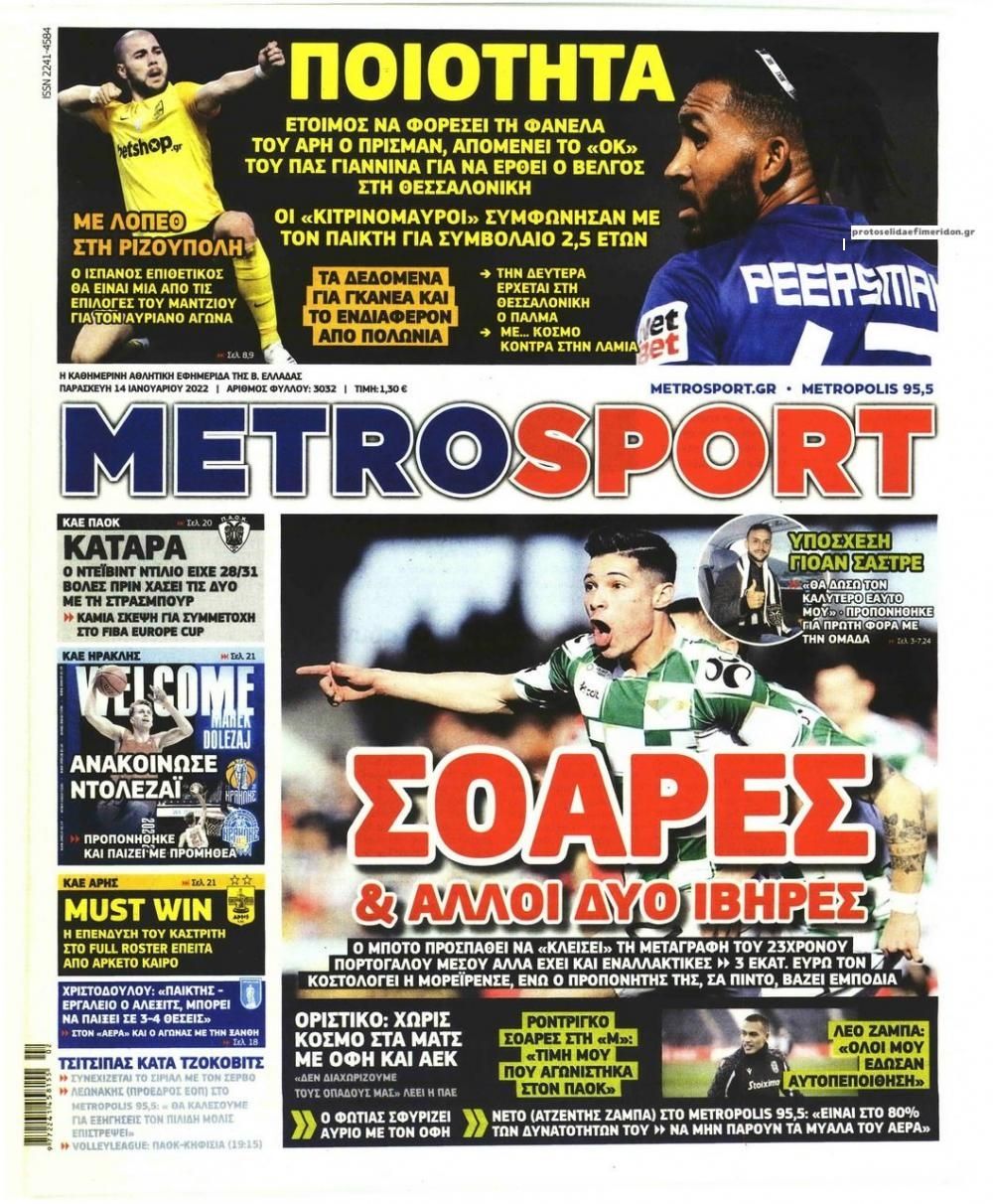 Σε αυτή τη σελίδα θα βρείτε το πρωτοσέλιδο της εφημερίδας Metrosport που κυκλοφόρησε Παρασκευή 14 Ιανoυαρίου 2022. Για να διαβάσετε το πρωτοσέλιδο της εφημερίδας Metrosport σε μεγαλύτερο μέγεθος κρατήστε το ποντίκι πατημένο πάνω στο μεγάλο πρωτοσέλιδο Metrosport και σύρετε προς την κατέυθυνση που θέλετε. Για να δείτε το ιστορικό αρχείο της εφημερίδας Metrosport πατήστε εδώ ή πατήστε από μενού "Αρχείο" και επιλέξτε από τη λίστα Metrosport.