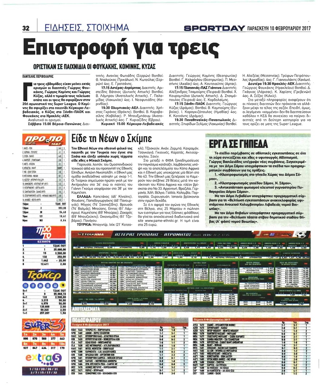 Σε αυτή τη σελίδα θα βρείτε το πρωτοσέλιδο της εφημερίδας Sportday που κυκλοφόρησε Παρασκευή 10 Φεβρουαρίου 2017. Για να διαβάσετε το πρωτοσέλιδο της εφημερίδας Sportday σε μεγαλύτερο μέγεθος κρατήστε το ποντίκι πατημένο πάνω στο μεγάλο πρωτοσέλιδο Sportday και σύρετε προς την κατέυθυνση που θέλετε. Για να δείτε το ιστορικό αρχείο της εφημερίδας Sportday πατήστε εδώ ή πατήστε από μενού "Αρχείο" και επιλέξτε από τη λίστα Sportday.