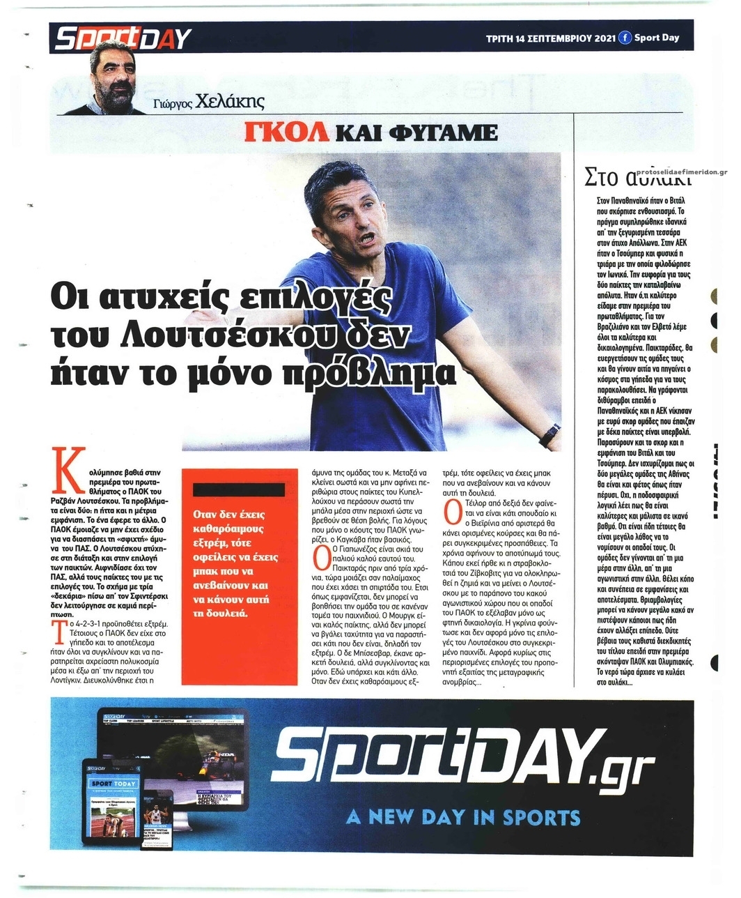 Σε αυτή τη σελίδα θα βρείτε το πρωτοσέλιδο της εφημερίδας Sportday που κυκλοφόρησε Τρίτη 14 Σεπτεμβρίου 2021. Για να διαβάσετε το πρωτοσέλιδο της εφημερίδας Sportday σε μεγαλύτερο μέγεθος κρατήστε το ποντίκι πατημένο πάνω στο μεγάλο πρωτοσέλιδο Sportday και σύρετε προς την κατέυθυνση που θέλετε. Για να δείτε το ιστορικό αρχείο της εφημερίδας Sportday πατήστε εδώ ή πατήστε από μενού "Αρχείο" και επιλέξτε από τη λίστα Sportday.