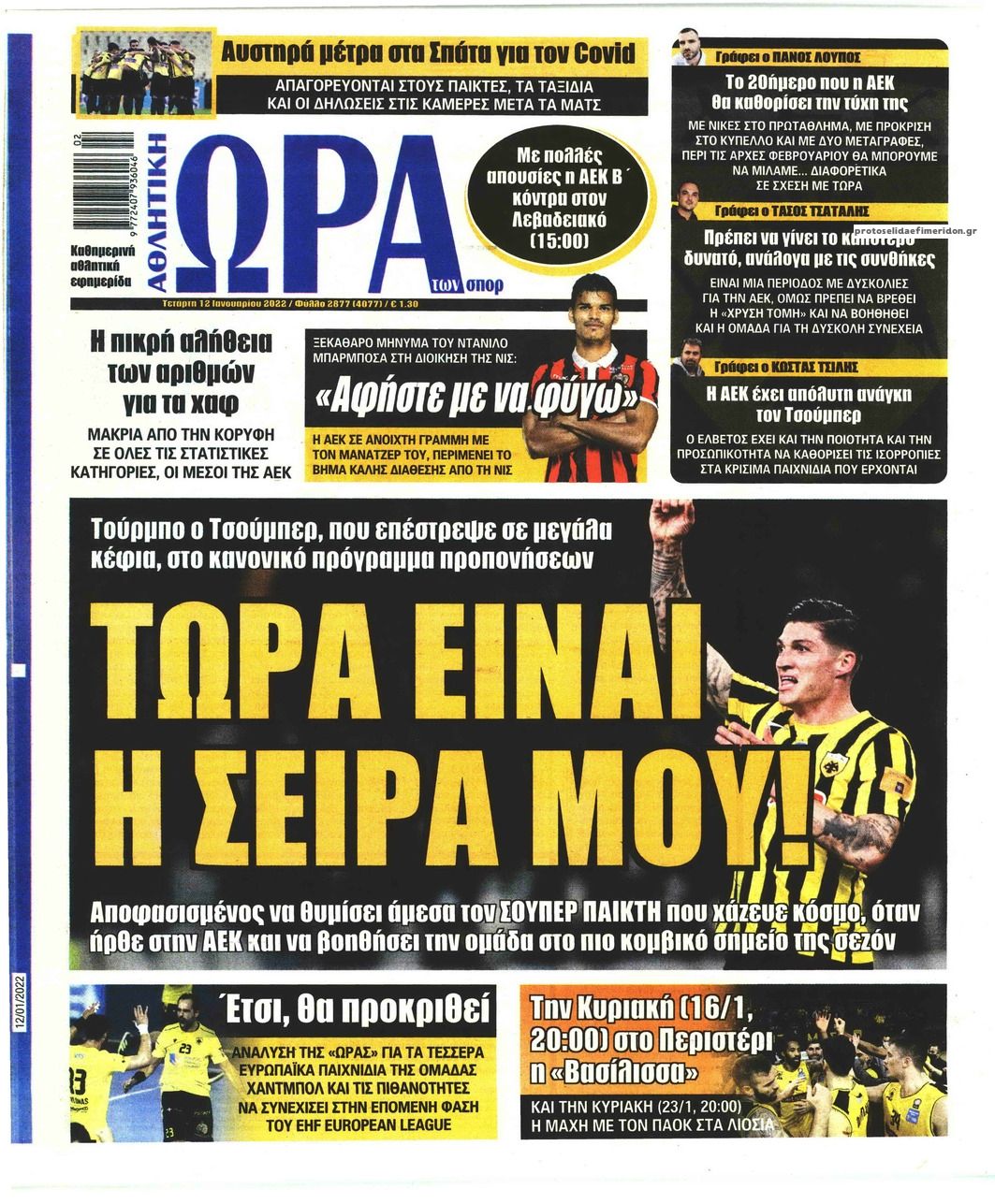 Σε αυτή τη σελίδα θα βρείτε το πρωτοσέλιδο της εφημερίδας Η ώρα των Σπορ που κυκλοφόρησε Τετάρτη 12 Ιανoυαρίου 2022. Για να διαβάσετε το πρωτοσέλιδο της εφημερίδας Η ώρα των Σπορ σε μεγαλύτερο μέγεθος κρατήστε το ποντίκι πατημένο πάνω στο μεγάλο πρωτοσέλιδο Η ώρα των Σπορ και σύρετε προς την κατέυθυνση που θέλετε. Για να δείτε το ιστορικό αρχείο της εφημερίδας Η ώρα των Σπορ πατήστε εδώ ή πατήστε από μενού "Αρχείο" και επιλέξτε από τη λίστα Η ώρα των Σπορ.