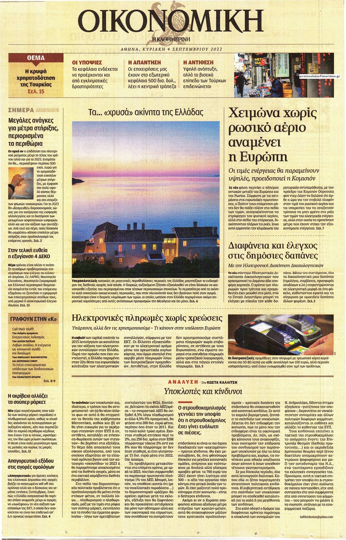 Διαβάστε το πρωτοσέλιδο της εφημερίδας Η ΚΑΘΗΜΕΡΙΝΗ - ΟΙΚΟΝΟΜΙΚΗ