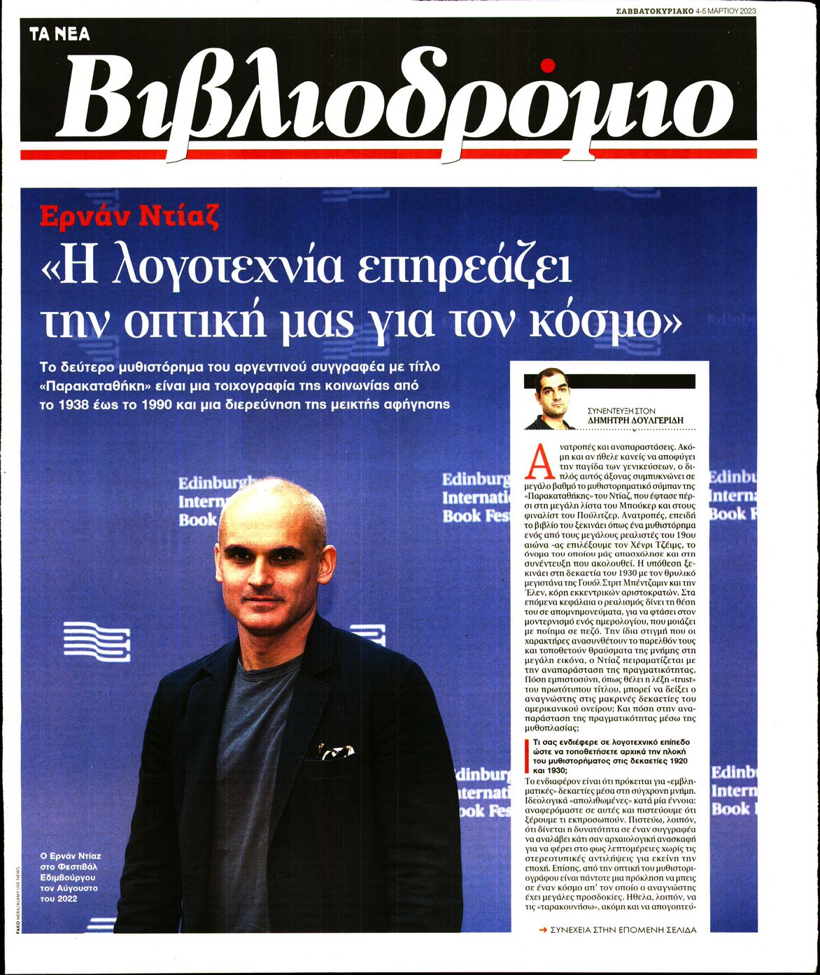 Σε αυτή τη σελίδα θα βρείτε το πρωτοσέλιδο της εφημερίδας ΤΑ ΝΕΑ - ΒΙΒΛΙΟΔΡΟΜΙΟ που κυκλοφόρησε Σάββατο 4 Μαρτίου 2023. Για να διαβάσετε το πρωτοσέλιδο της εφημερίδας ΤΑ ΝΕΑ - ΒΙΒΛΙΟΔΡΟΜΙΟ σε μεγαλύτερο μέγεθος κρατήστε το ποντίκι πατημένο πάνω στο μεγάλο πρωτοσέλιδο ΤΑ ΝΕΑ - ΒΙΒΛΙΟΔΡΟΜΙΟ και σύρετε προς την κατέυθυνση που θέλετε. Για να δείτε το ιστορικό αρχείο της εφημερίδας ΤΑ ΝΕΑ - ΒΙΒΛΙΟΔΡΟΜΙΟ πατήστε εδώ ή πατήστε από μενού "Αρχείο" και επιλέξτε από τη λίστα ΤΑ ΝΕΑ - ΒΙΒΛΙΟΔΡΟΜΙΟ.