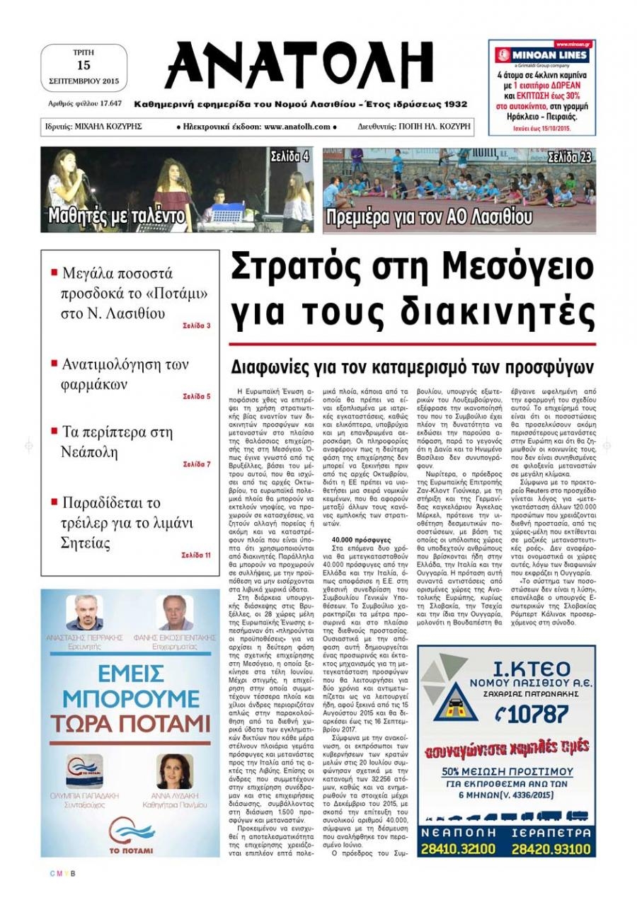Σε αυτή τη σελίδα θα βρείτε το πρωτοσέλιδο της εφημερίδας Ανατολή που κυκλοφόρησε Τρίτη 15 Σεπτεμβρίου 2015. Για να διαβάσετε το πρωτοσέλιδο της εφημερίδας Ανατολή σε μεγαλύτερο μέγεθος κρατήστε το ποντίκι πατημένο πάνω στο μεγάλο πρωτοσέλιδο Ανατολή και σύρετε προς την κατέυθυνση που θέλετε. Για να δείτε το ιστορικό αρχείο της εφημερίδας Ανατολή πατήστε εδώ ή πατήστε από μενού "Αρχείο" και επιλέξτε από τη λίστα Ανατολή.