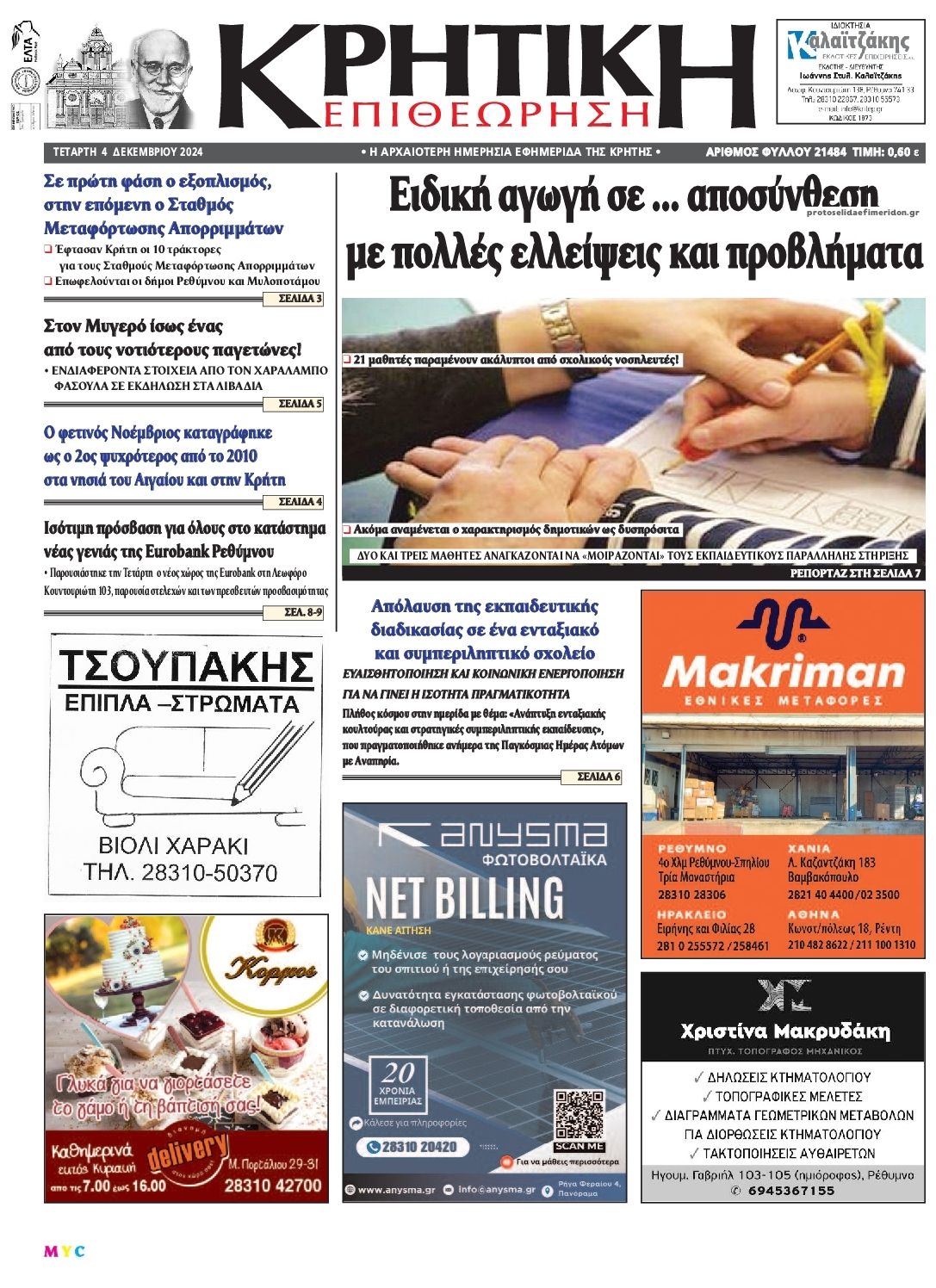Διαβάστε το πρωτοσέλιδο της εφημερίδας Κρητική Επιθεώρηση