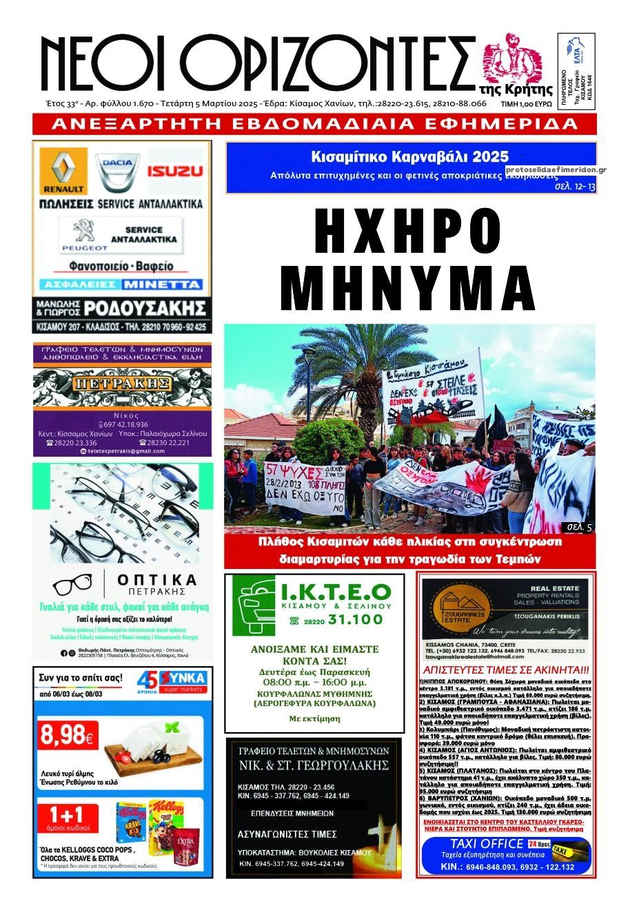 Διαβάστε το πρωτοσέλιδο της εφημερίδας Νέοι Ορίζοντες