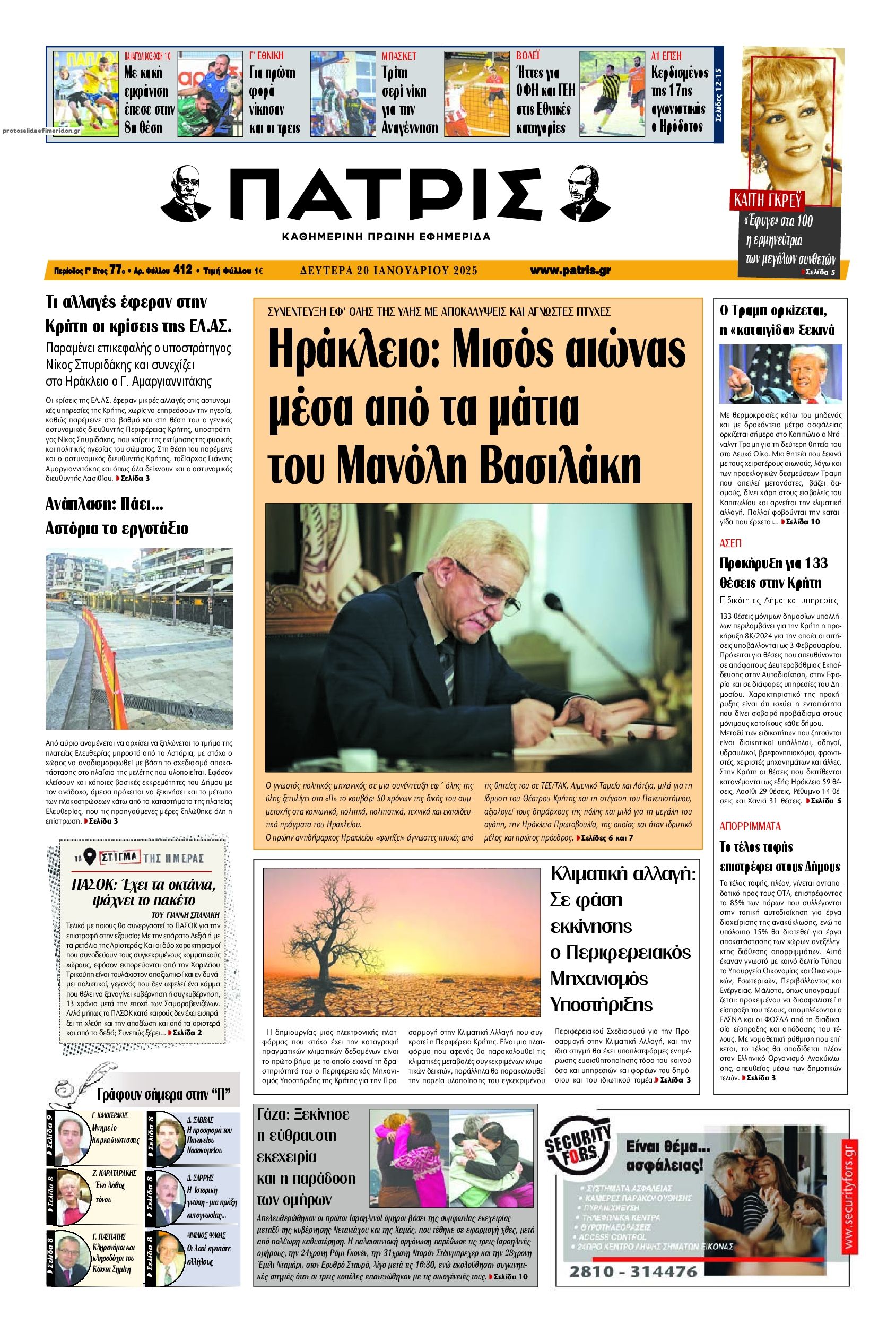 Σε αυτή τη σελίδα θα βρείτε το πρωτοσέλιδο της εφημερίδας Πατρίς που κυκλοφόρησε Δευτέρα 20 Ιανoυαρίου 2025. Για να διαβάσετε το πρωτοσέλιδο της εφημερίδας Πατρίς σε μεγαλύτερο μέγεθος κρατήστε το ποντίκι πατημένο πάνω στο μεγάλο πρωτοσέλιδο Πατρίς και σύρετε προς την κατέυθυνση που θέλετε. Για να δείτε το ιστορικό αρχείο της εφημερίδας Πατρίς πατήστε εδώ ή πατήστε από μενού "Αρχείο" και επιλέξτε από τη λίστα Πατρίς.
