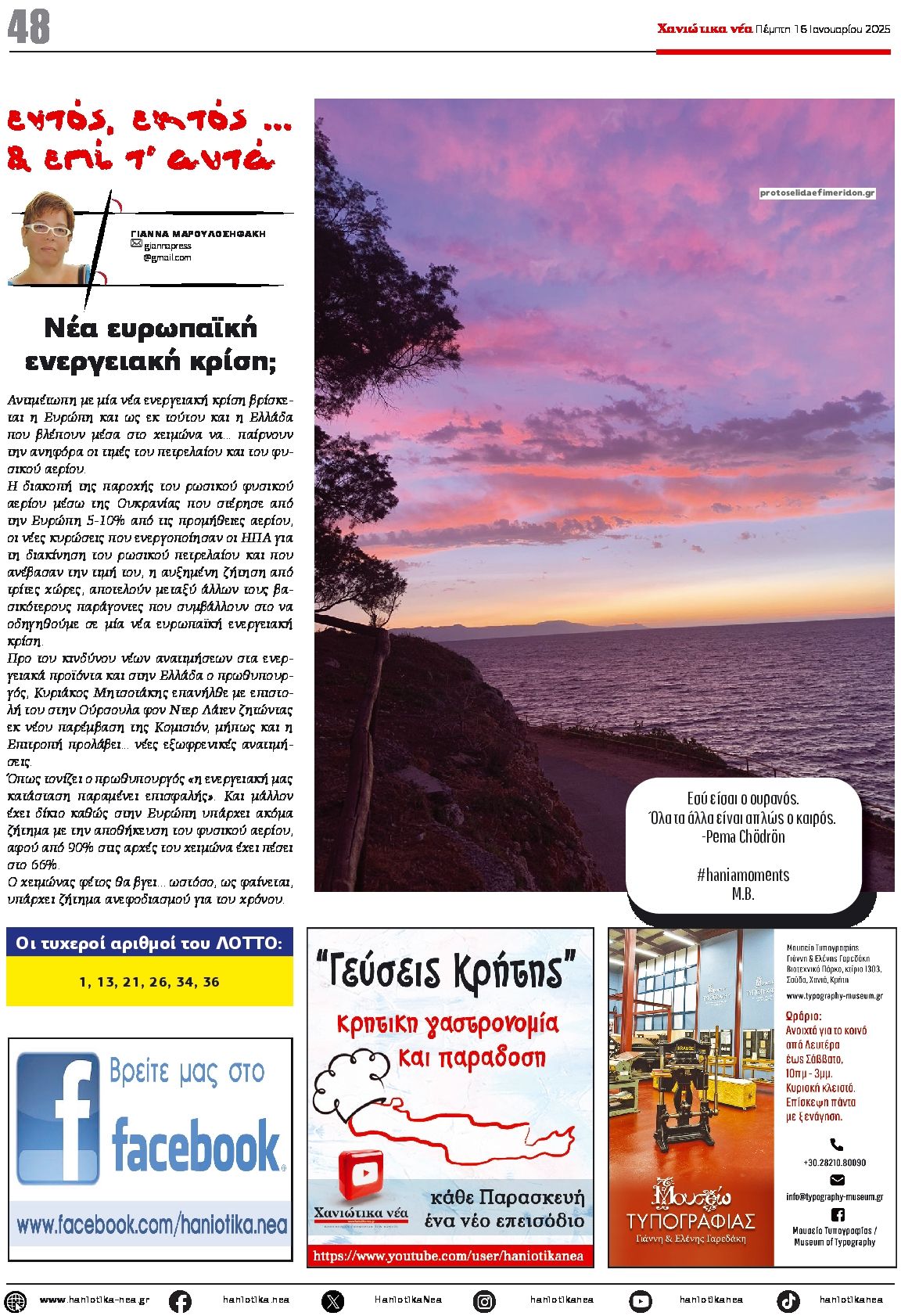 Σε αυτή τη σελίδα θα βρείτε το πρωτοσέλιδο της εφημερίδας Χανιώτικα Νέα που κυκλοφόρησε Πέμπτη 16 Ιανoυαρίου 2025. Για να διαβάσετε το πρωτοσέλιδο της εφημερίδας Χανιώτικα Νέα σε μεγαλύτερο μέγεθος κρατήστε το ποντίκι πατημένο πάνω στο μεγάλο πρωτοσέλιδο Χανιώτικα Νέα και σύρετε προς την κατέυθυνση που θέλετε. Για να δείτε το ιστορικό αρχείο της εφημερίδας Χανιώτικα Νέα πατήστε εδώ ή πατήστε από μενού "Αρχείο" και επιλέξτε από τη λίστα Χανιώτικα Νέα.