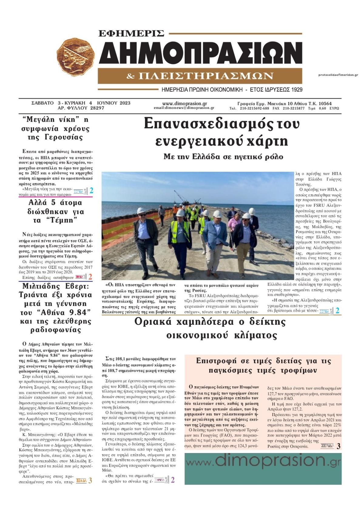 Σε αυτή τη σελίδα θα βρείτε το πρωτοσέλιδο της εφημερίδας Δημοπρασιών που κυκλοφόρησε Σάββατο 3 Ιουνίου 2023. Για να διαβάσετε το πρωτοσέλιδο της εφημερίδας Δημοπρασιών σε μεγαλύτερο μέγεθος κρατήστε το ποντίκι πατημένο πάνω στο μεγάλο πρωτοσέλιδο Δημοπρασιών και σύρετε προς την κατέυθυνση που θέλετε. Για να δείτε το ιστορικό αρχείο της εφημερίδας Δημοπρασιών πατήστε εδώ ή πατήστε από μενού "Αρχείο" και επιλέξτε από τη λίστα Δημοπρασιών.