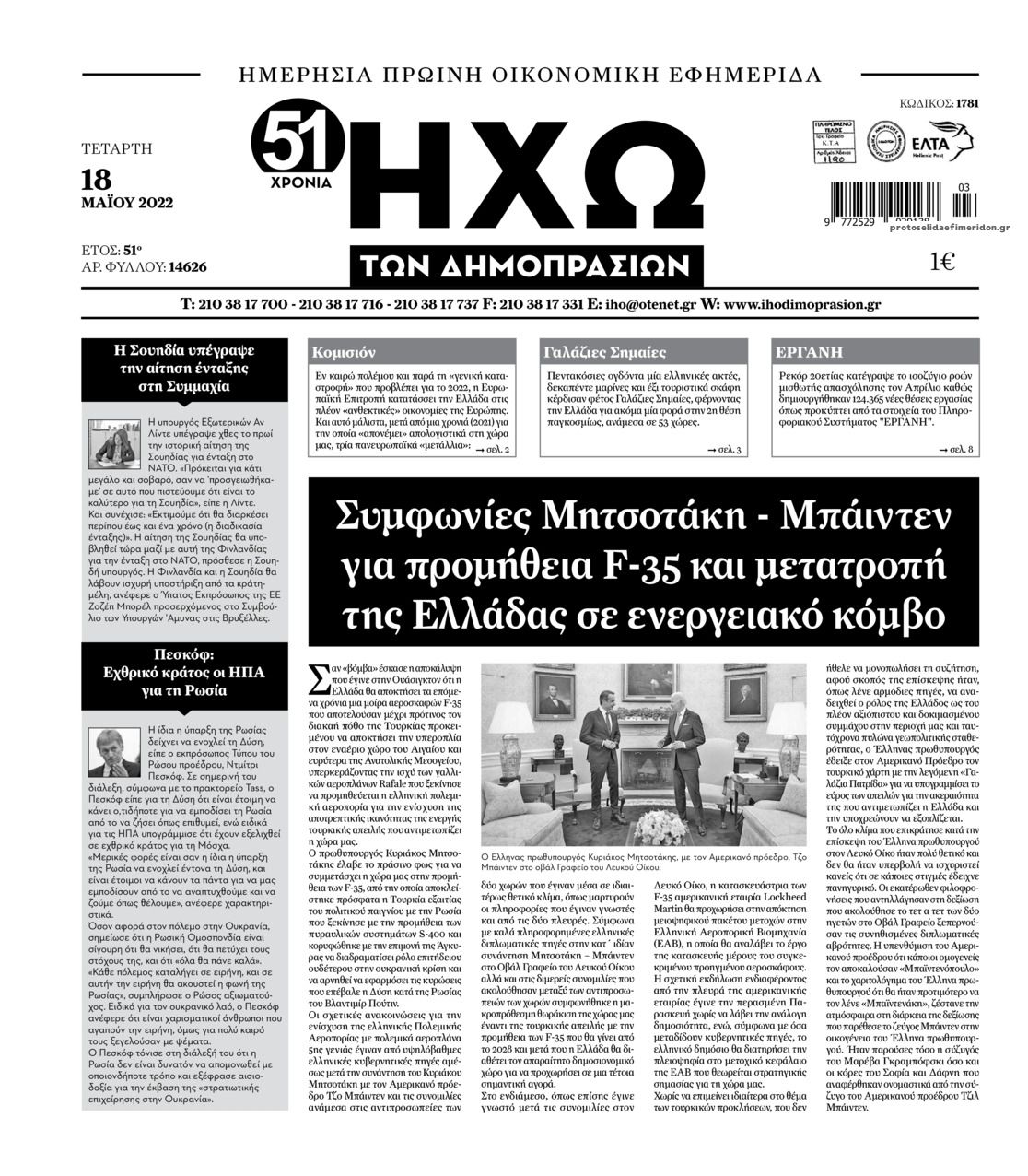 Σε αυτή τη σελίδα θα βρείτε το πρωτοσέλιδο της εφημερίδας Ηχώ που κυκλοφόρησε Τετάρτη 18 Μαΐου 2022. Για να διαβάσετε το πρωτοσέλιδο της εφημερίδας Ηχώ σε μεγαλύτερο μέγεθος κρατήστε το ποντίκι πατημένο πάνω στο μεγάλο πρωτοσέλιδο Ηχώ και σύρετε προς την κατέυθυνση που θέλετε. Για να δείτε το ιστορικό αρχείο της εφημερίδας Ηχώ πατήστε εδώ ή πατήστε από μενού "Αρχείο" και επιλέξτε από τη λίστα Ηχώ.
