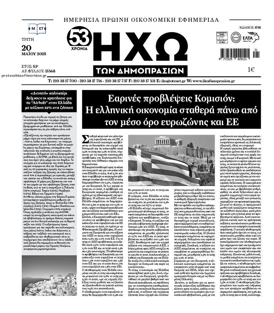 Σε αυτή τη σελίδα θα βρείτε το πρωτοσέλιδο της εφημερίδας Ηχώ που κυκλοφόρησε Τρίτη 20 Μαΐου 2025. Για να διαβάσετε το πρωτοσέλιδο της εφημερίδας Ηχώ σε μεγαλύτερο μέγεθος κρατήστε το ποντίκι πατημένο πάνω στο μεγάλο πρωτοσέλιδο Ηχώ και σύρετε προς την κατέυθυνση που θέλετε. Για να δείτε το ιστορικό αρχείο της εφημερίδας Ηχώ πατήστε εδώ ή πατήστε από μενού "Αρχείο" και επιλέξτε από τη λίστα Ηχώ.