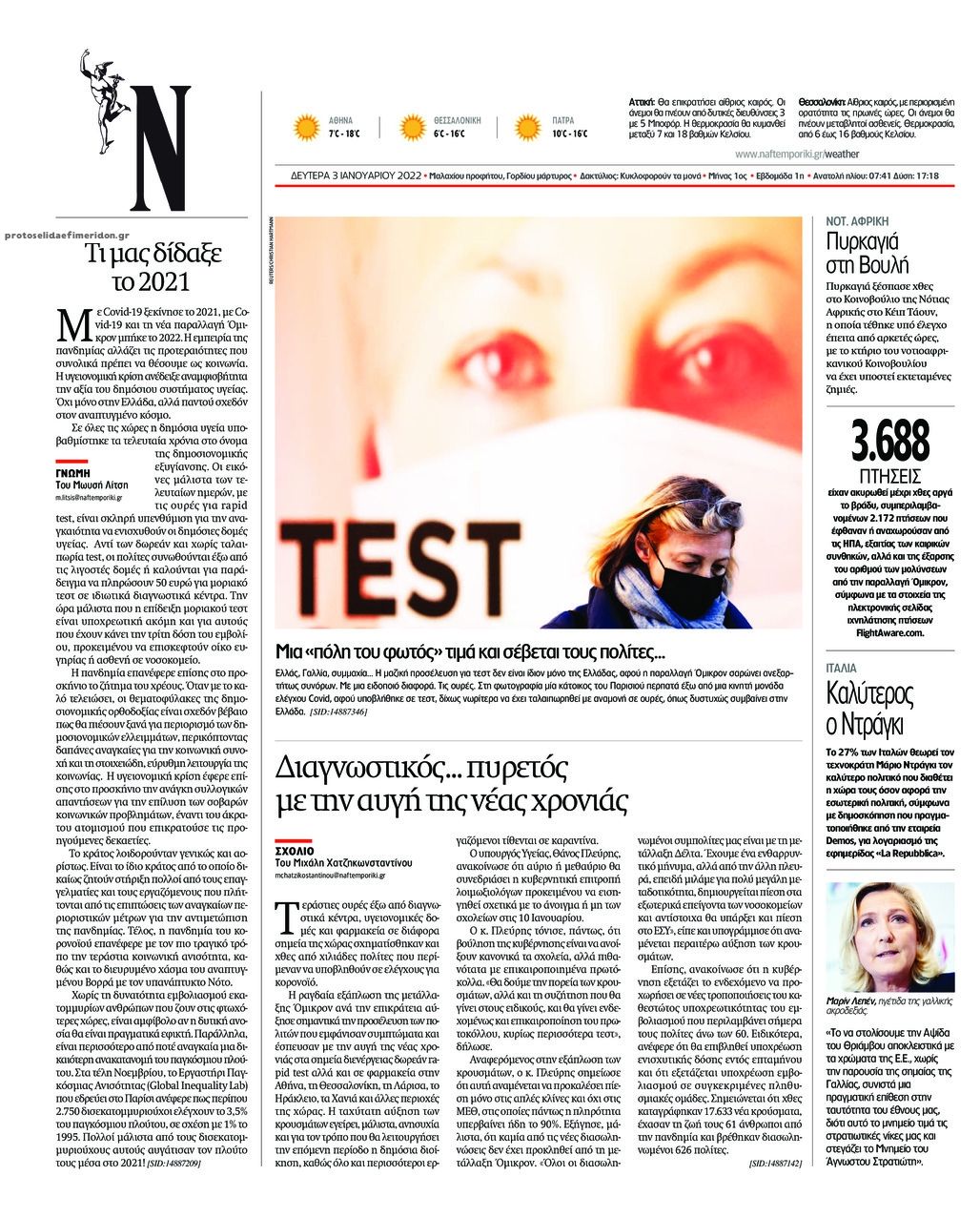 Σε αυτή τη σελίδα θα βρείτε το πρωτοσέλιδο της εφημερίδας Ναυτεμπορική που κυκλοφόρησε Δευτέρα 3 Ιανoυαρίου 2022. Για να διαβάσετε το πρωτοσέλιδο της εφημερίδας Ναυτεμπορική σε μεγαλύτερο μέγεθος κρατήστε το ποντίκι πατημένο πάνω στο μεγάλο πρωτοσέλιδο Ναυτεμπορική και σύρετε προς την κατέυθυνση που θέλετε. Για να δείτε το ιστορικό αρχείο της εφημερίδας Ναυτεμπορική πατήστε εδώ ή πατήστε από μενού "Αρχείο" και επιλέξτε από τη λίστα Ναυτεμπορική.