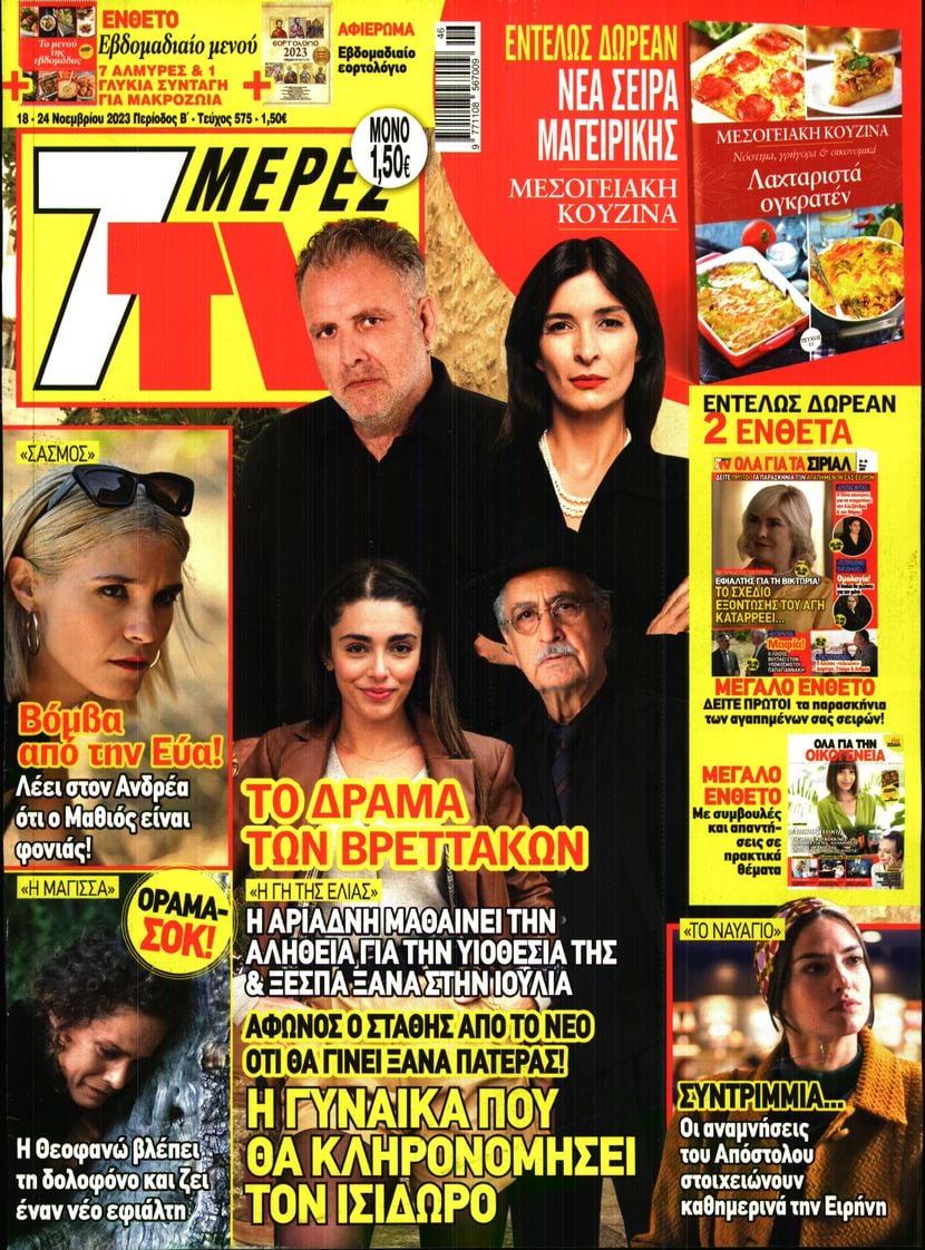 Σε αυτή τη σελίδα θα βρείτε το πρωτοσέλιδο της εφημερίδας 7 ΜΕΡΕΣ TV που κυκλοφόρησε Σάββατο 18 Νοεμβρίου 2023. Για να διαβάσετε το πρωτοσέλιδο της εφημερίδας 7 ΜΕΡΕΣ TV σε μεγαλύτερο μέγεθος κρατήστε το ποντίκι πατημένο πάνω στο μεγάλο πρωτοσέλιδο 7 ΜΕΡΕΣ TV και σύρετε προς την κατέυθυνση που θέλετε. Για να δείτε το ιστορικό αρχείο της εφημερίδας 7 ΜΕΡΕΣ TV πατήστε εδώ ή πατήστε από μενού "Αρχείο" και επιλέξτε από τη λίστα 7 ΜΕΡΕΣ TV.