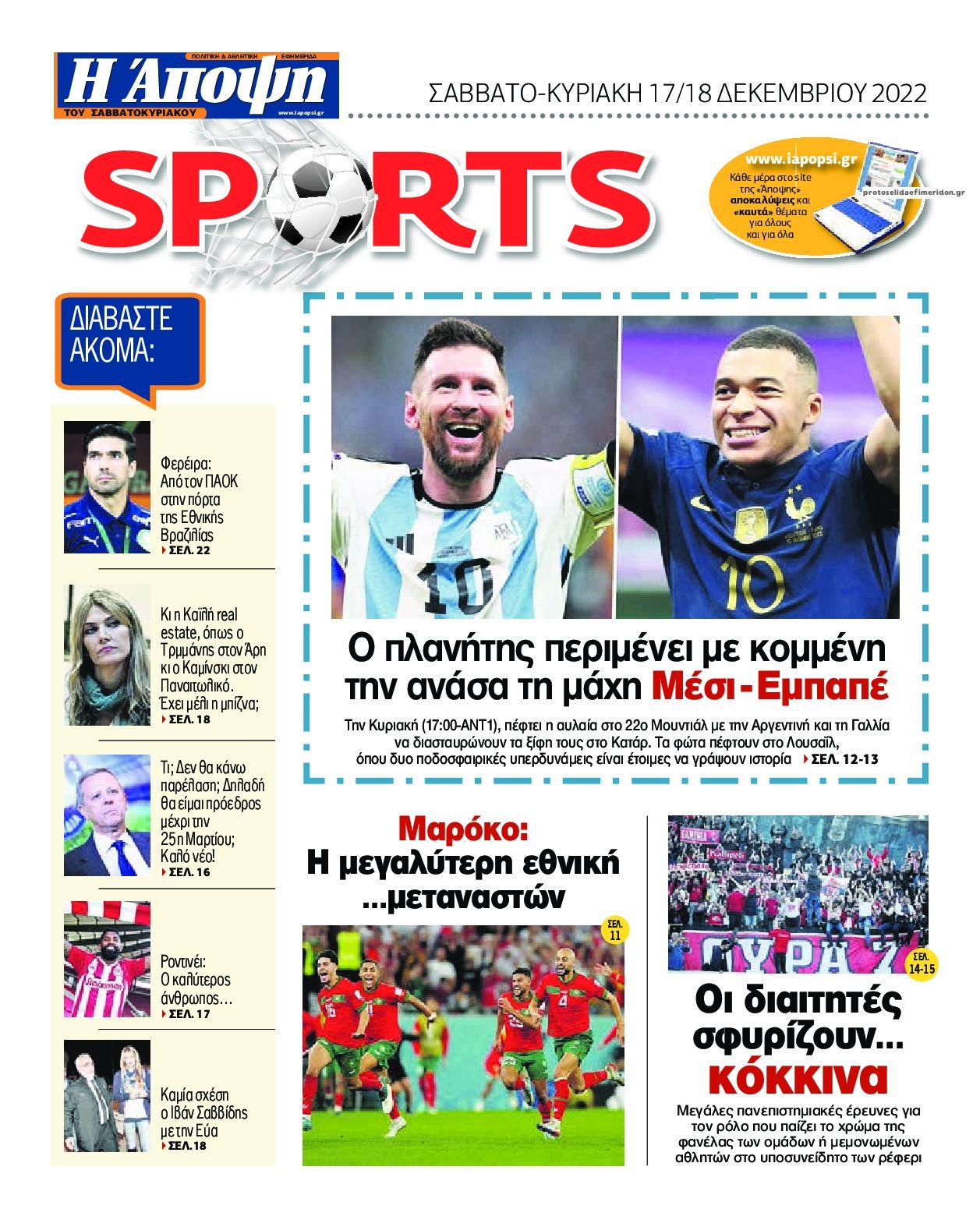 Σε αυτή τη σελίδα θα βρείτε το πρωτοσέλιδο της εφημερίδας Η Άποψη που κυκλοφόρησε Σάββατο 17 Δεκεμβρίου 2022. Για να διαβάσετε το πρωτοσέλιδο της εφημερίδας Η Άποψη σε μεγαλύτερο μέγεθος κρατήστε το ποντίκι πατημένο πάνω στο μεγάλο πρωτοσέλιδο Η Άποψη και σύρετε προς την κατέυθυνση που θέλετε. Για να δείτε το ιστορικό αρχείο της εφημερίδας Η Άποψη πατήστε εδώ ή πατήστε από μενού "Αρχείο" και επιλέξτε από τη λίστα Η Άποψη.