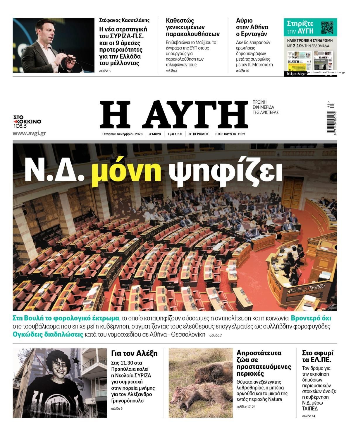 Σε αυτή τη σελίδα θα βρείτε το πρωτοσέλιδο της εφημερίδας Αυγή που κυκλοφόρησε Τετάρτη 6 Δεκεμβρίου 2023. Για να διαβάσετε το πρωτοσέλιδο της εφημερίδας Αυγή σε μεγαλύτερο μέγεθος κρατήστε το ποντίκι πατημένο πάνω στο μεγάλο πρωτοσέλιδο Αυγή και σύρετε προς την κατέυθυνση που θέλετε. Για να δείτε το ιστορικό αρχείο της εφημερίδας Αυγή πατήστε εδώ ή πατήστε από μενού "Αρχείο" και επιλέξτε από τη λίστα Αυγή.