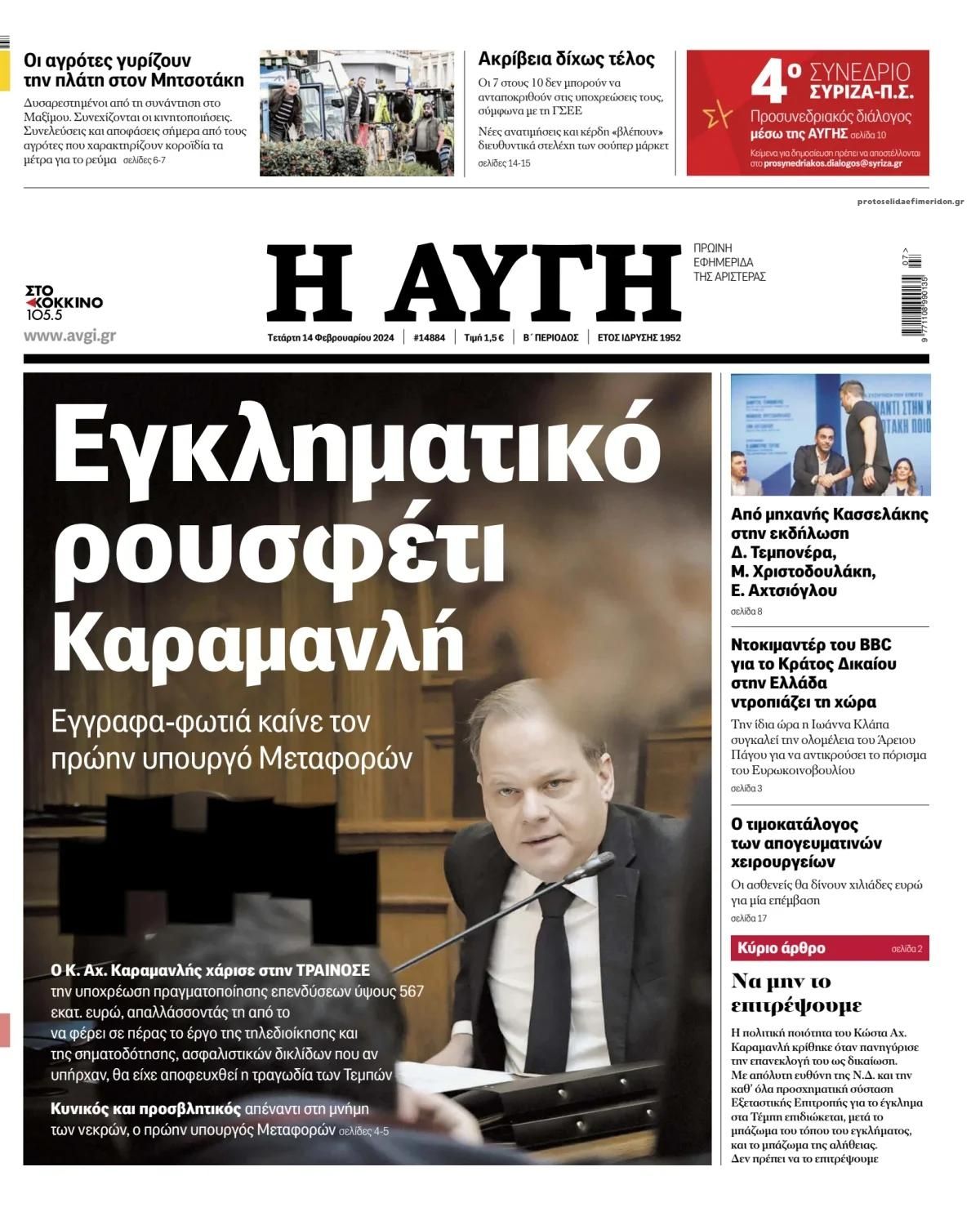 Διαβάστε το πρωτοσέλιδο της εφημερίδας Αυγή