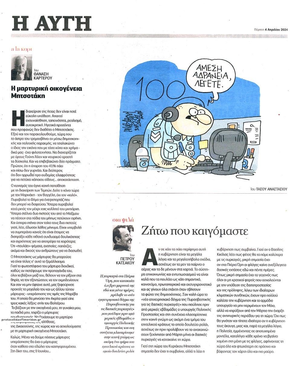 Σε αυτή τη σελίδα θα βρείτε το πρωτοσέλιδο της εφημερίδας Αυγή που κυκλοφόρησε Πέμπτη 4 Απριλίου 2024. Για να διαβάσετε το πρωτοσέλιδο της εφημερίδας Αυγή σε μεγαλύτερο μέγεθος κρατήστε το ποντίκι πατημένο πάνω στο μεγάλο πρωτοσέλιδο Αυγή και σύρετε προς την κατέυθυνση που θέλετε. Για να δείτε το ιστορικό αρχείο της εφημερίδας Αυγή πατήστε εδώ ή πατήστε από μενού "Αρχείο" και επιλέξτε από τη λίστα Αυγή.