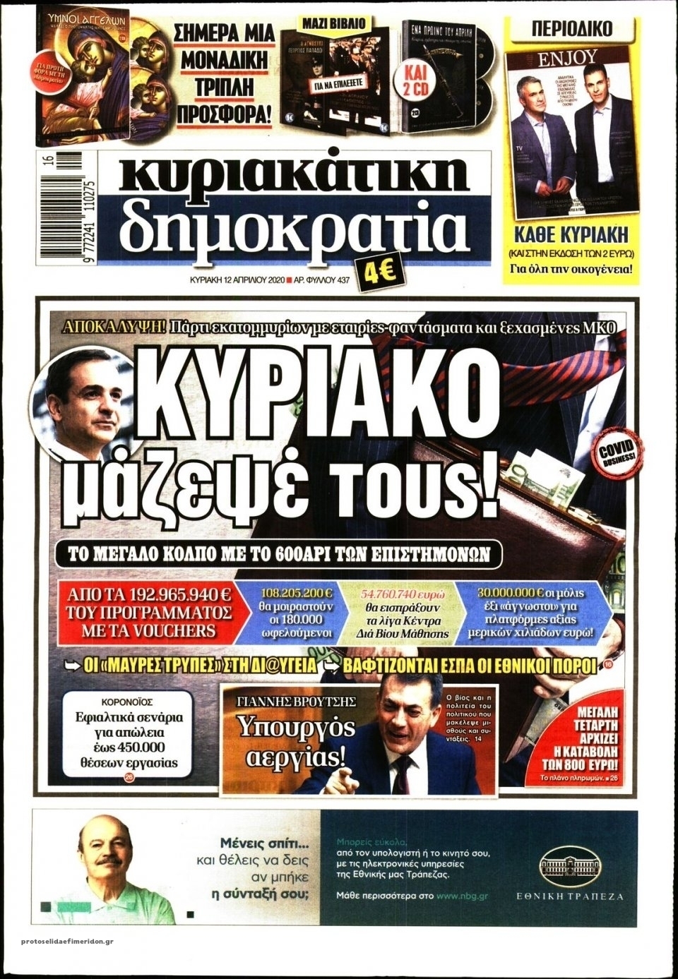 Σε αυτή τη σελίδα θα βρείτε το πρωτοσέλιδο της εφημερίδας Δημοκρατία που κυκλοφόρησε Κυριακή 12 Απριλίου 2020. Για να διαβάσετε το πρωτοσέλιδο της εφημερίδας Δημοκρατία σε μεγαλύτερο μέγεθος κρατήστε το ποντίκι πατημένο πάνω στο μεγάλο πρωτοσέλιδο Δημοκρατία και σύρετε προς την κατέυθυνση που θέλετε. Για να δείτε το ιστορικό αρχείο της εφημερίδας Δημοκρατία πατήστε εδώ ή πατήστε από μενού "Αρχείο" και επιλέξτε από τη λίστα Δημοκρατία.