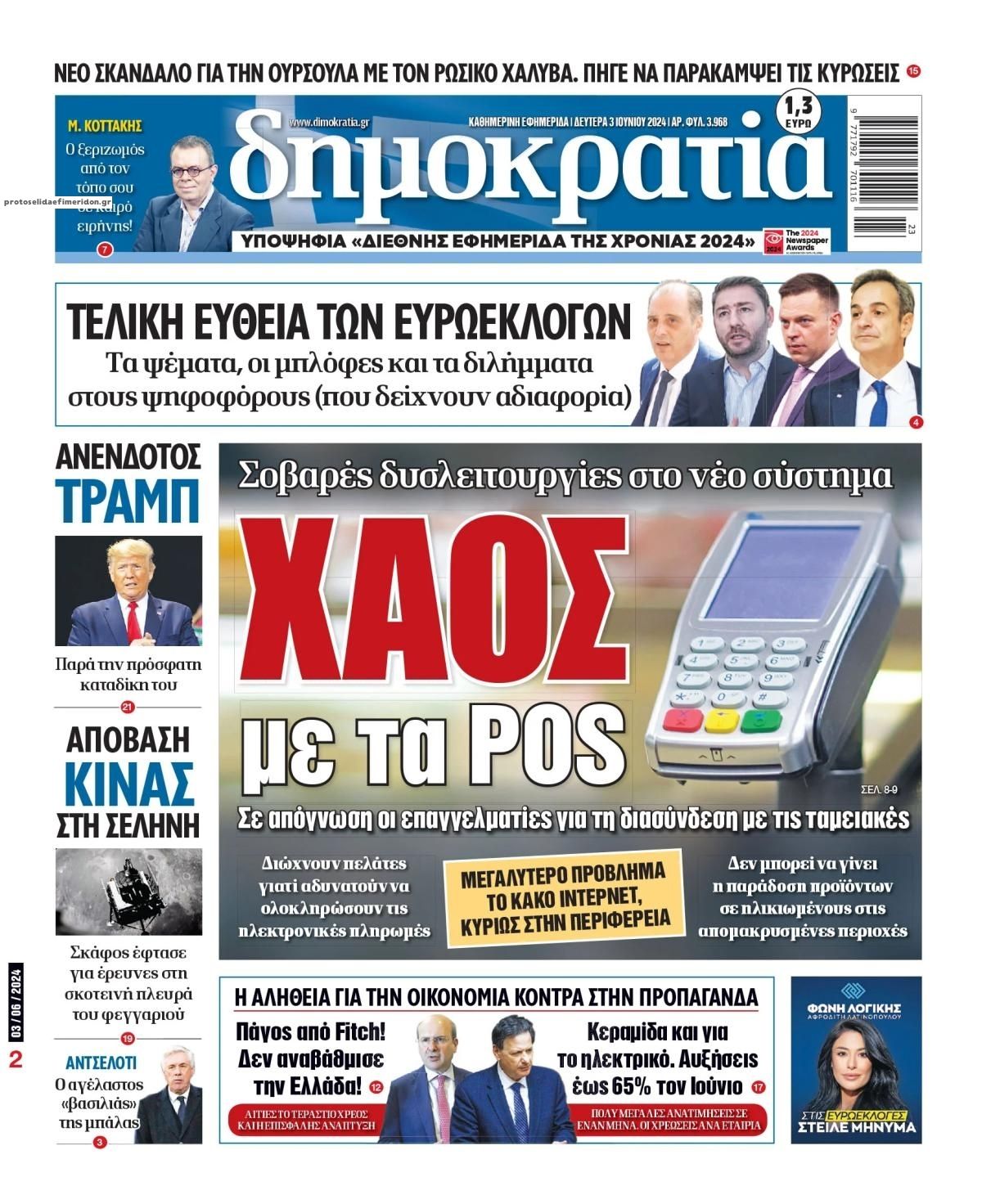 Διαβάστε το πρωτοσέλιδο της εφημερίδας Δημοκρατία