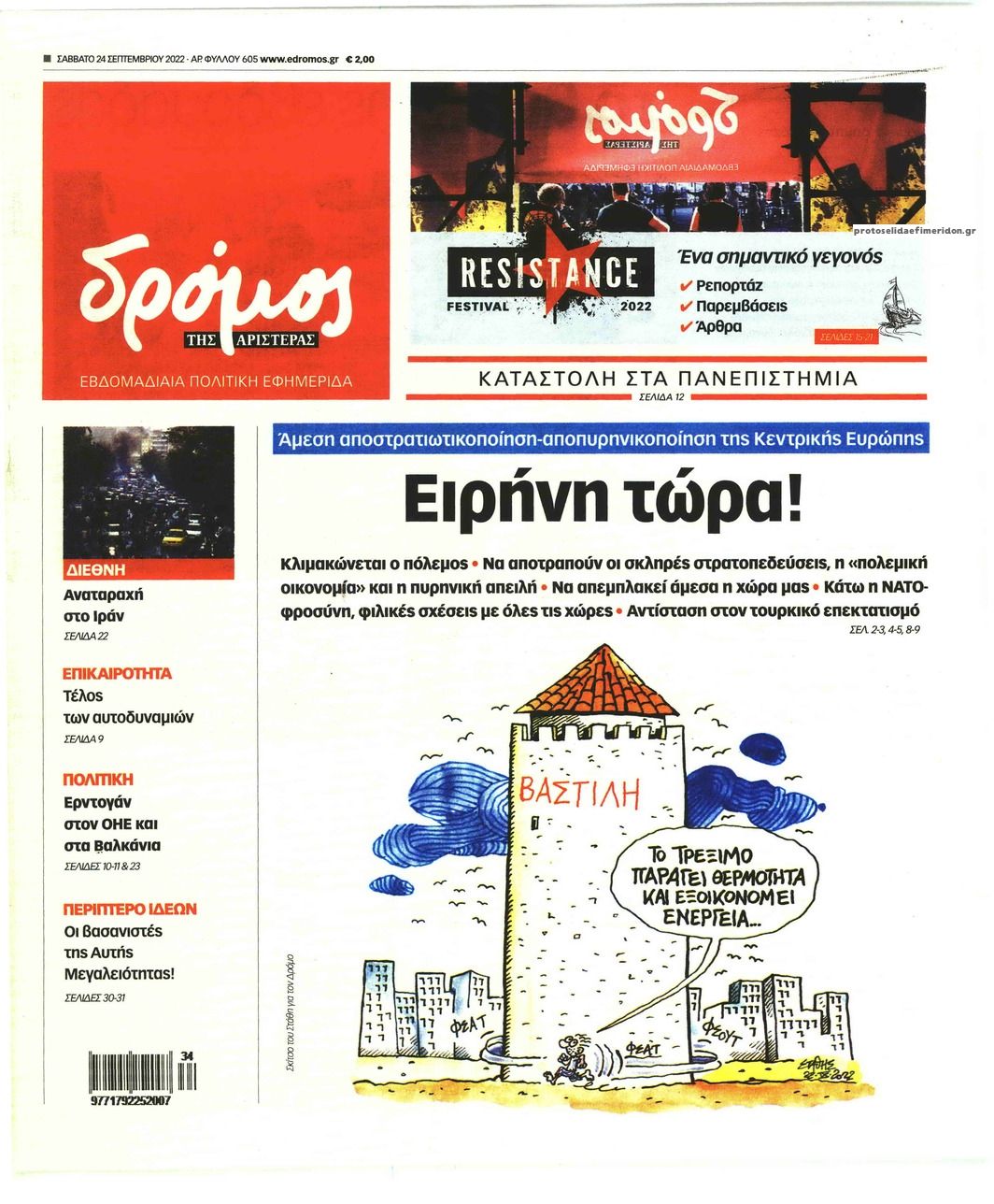 Σε αυτή τη σελίδα θα βρείτε το πρωτοσέλιδο της εφημερίδας Δρόμος Αριστεράς που κυκλοφόρησε Σάββατο 24 Σεπτεμβρίου 2022. Για να διαβάσετε το πρωτοσέλιδο της εφημερίδας Δρόμος Αριστεράς σε μεγαλύτερο μέγεθος κρατήστε το ποντίκι πατημένο πάνω στο μεγάλο πρωτοσέλιδο Δρόμος Αριστεράς και σύρετε προς την κατέυθυνση που θέλετε. Για να δείτε το ιστορικό αρχείο της εφημερίδας Δρόμος Αριστεράς πατήστε εδώ ή πατήστε από μενού "Αρχείο" και επιλέξτε από τη λίστα Δρόμος Αριστεράς.
