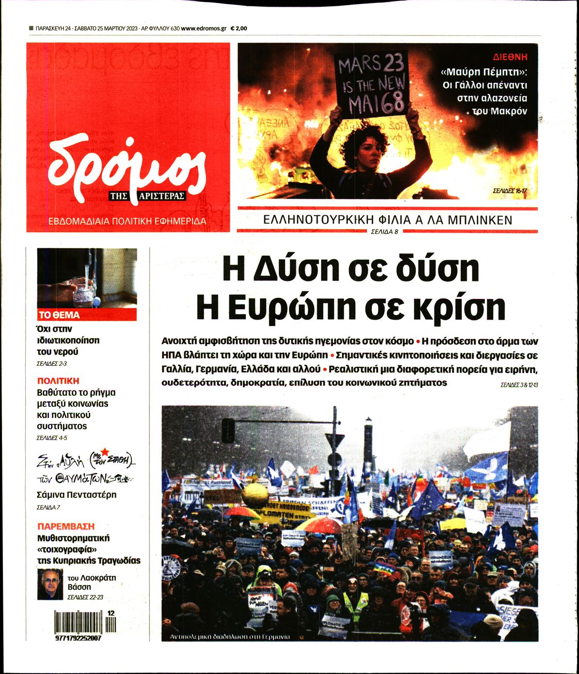 Σε αυτή τη σελίδα θα βρείτε το πρωτοσέλιδο της εφημερίδας Δρόμος Αριστεράς που κυκλοφόρησε Παρασκευή 24 Μαρτίου 2023. Για να διαβάσετε το πρωτοσέλιδο της εφημερίδας Δρόμος Αριστεράς σε μεγαλύτερο μέγεθος κρατήστε το ποντίκι πατημένο πάνω στο μεγάλο πρωτοσέλιδο Δρόμος Αριστεράς και σύρετε προς την κατέυθυνση που θέλετε. Για να δείτε το ιστορικό αρχείο της εφημερίδας Δρόμος Αριστεράς πατήστε εδώ ή πατήστε από μενού "Αρχείο" και επιλέξτε από τη λίστα Δρόμος Αριστεράς.