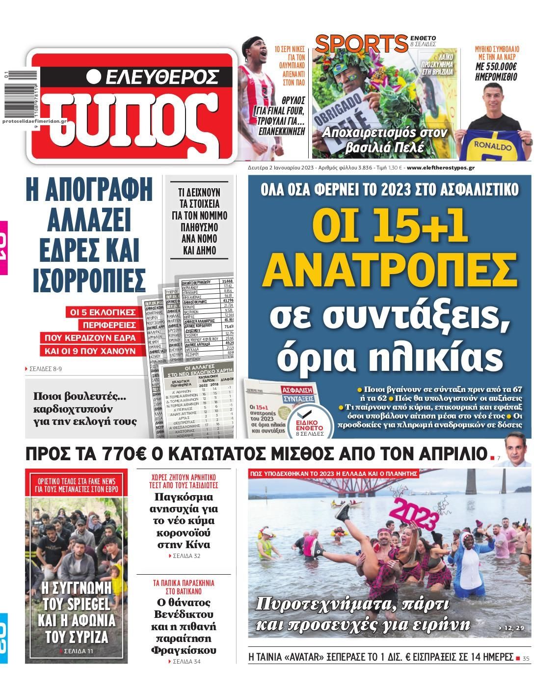 Σε αυτή τη σελίδα θα βρείτε το πρωτοσέλιδο της εφημερίδας Ελεύθερος Τύπος που κυκλοφόρησε Δευτέρα 2 Ιανoυαρίου 2023. Για να διαβάσετε το πρωτοσέλιδο της εφημερίδας Ελεύθερος Τύπος σε μεγαλύτερο μέγεθος κρατήστε το ποντίκι πατημένο πάνω στο μεγάλο πρωτοσέλιδο Ελεύθερος Τύπος και σύρετε προς την κατέυθυνση που θέλετε. Για να δείτε το ιστορικό αρχείο της εφημερίδας Ελεύθερος Τύπος πατήστε εδώ ή πατήστε από μενού "Αρχείο" και επιλέξτε από τη λίστα Ελεύθερος Τύπος.