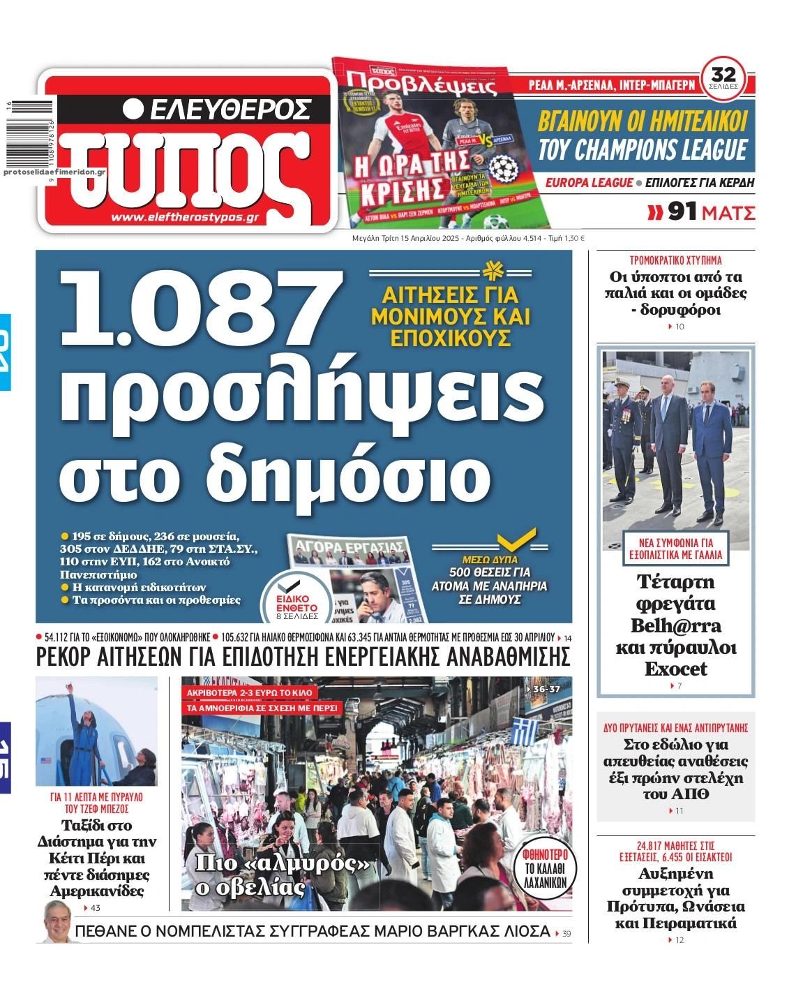 Διαβάστε το πρωτοσέλιδο της εφημερίδας Ελεύθερος Τύπος