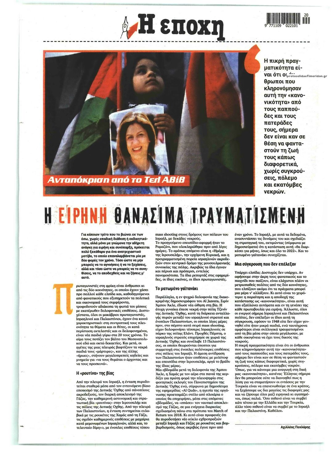Σε αυτή τη σελίδα θα βρείτε το πρωτοσέλιδο της εφημερίδας Εποχή που κυκλοφόρησε Σάββατο 21 Μαΐου 2022. Για να διαβάσετε το πρωτοσέλιδο της εφημερίδας Εποχή σε μεγαλύτερο μέγεθος κρατήστε το ποντίκι πατημένο πάνω στο μεγάλο πρωτοσέλιδο Εποχή και σύρετε προς την κατέυθυνση που θέλετε. Για να δείτε το ιστορικό αρχείο της εφημερίδας Εποχή πατήστε εδώ ή πατήστε από μενού "Αρχείο" και επιλέξτε από τη λίστα Εποχή.