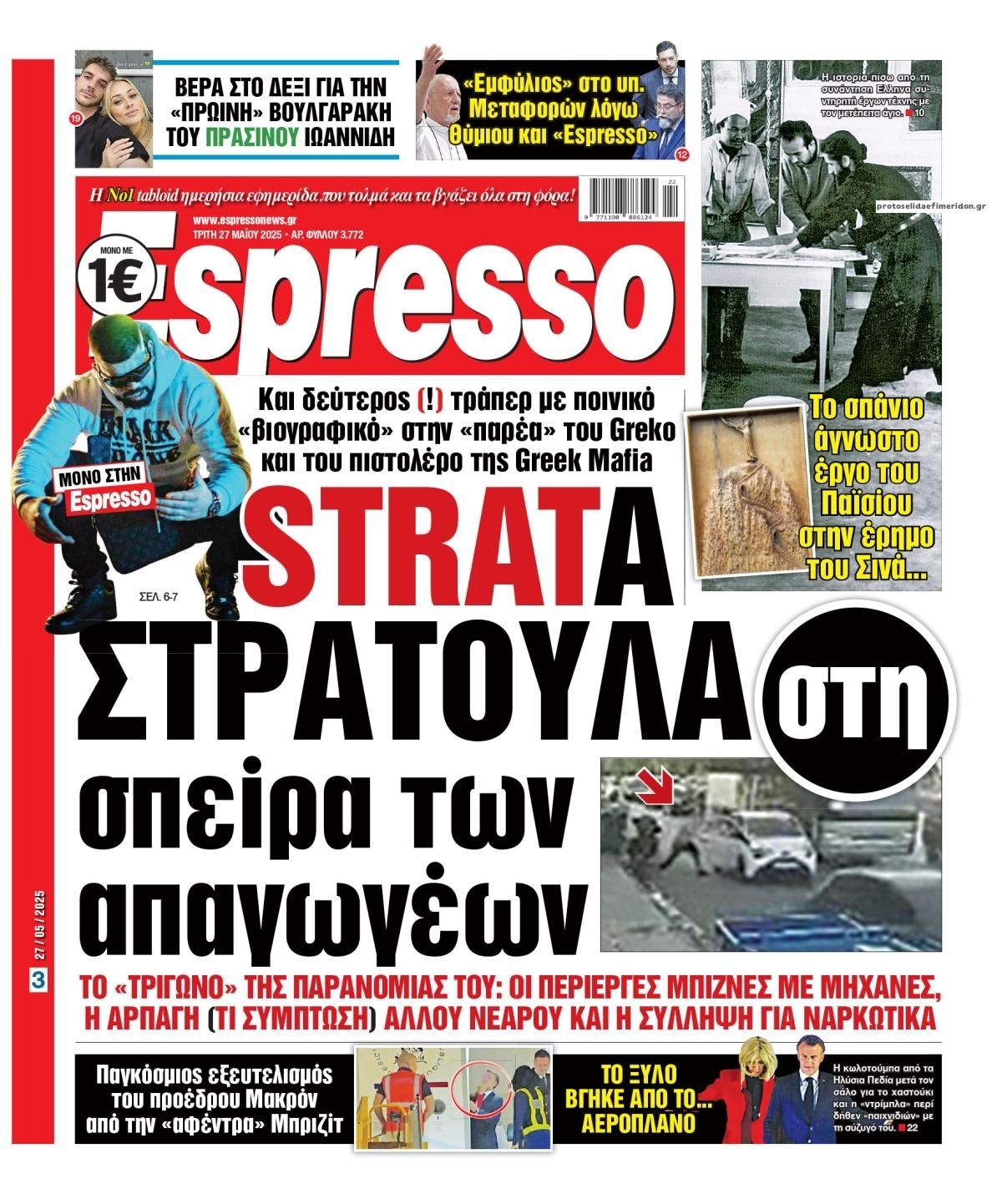 Σε αυτή τη σελίδα θα βρείτε το πρωτοσέλιδο της εφημερίδας Espresso που κυκλοφόρησε Τρίτη 27 Μαΐου 2025. Για να διαβάσετε το πρωτοσέλιδο της εφημερίδας Espresso σε μεγαλύτερο μέγεθος κρατήστε το ποντίκι πατημένο πάνω στο μεγάλο πρωτοσέλιδο Espresso και σύρετε προς την κατέυθυνση που θέλετε. Για να δείτε το ιστορικό αρχείο της εφημερίδας Espresso πατήστε εδώ ή πατήστε από μενού "Αρχείο" και επιλέξτε από τη λίστα Espresso.