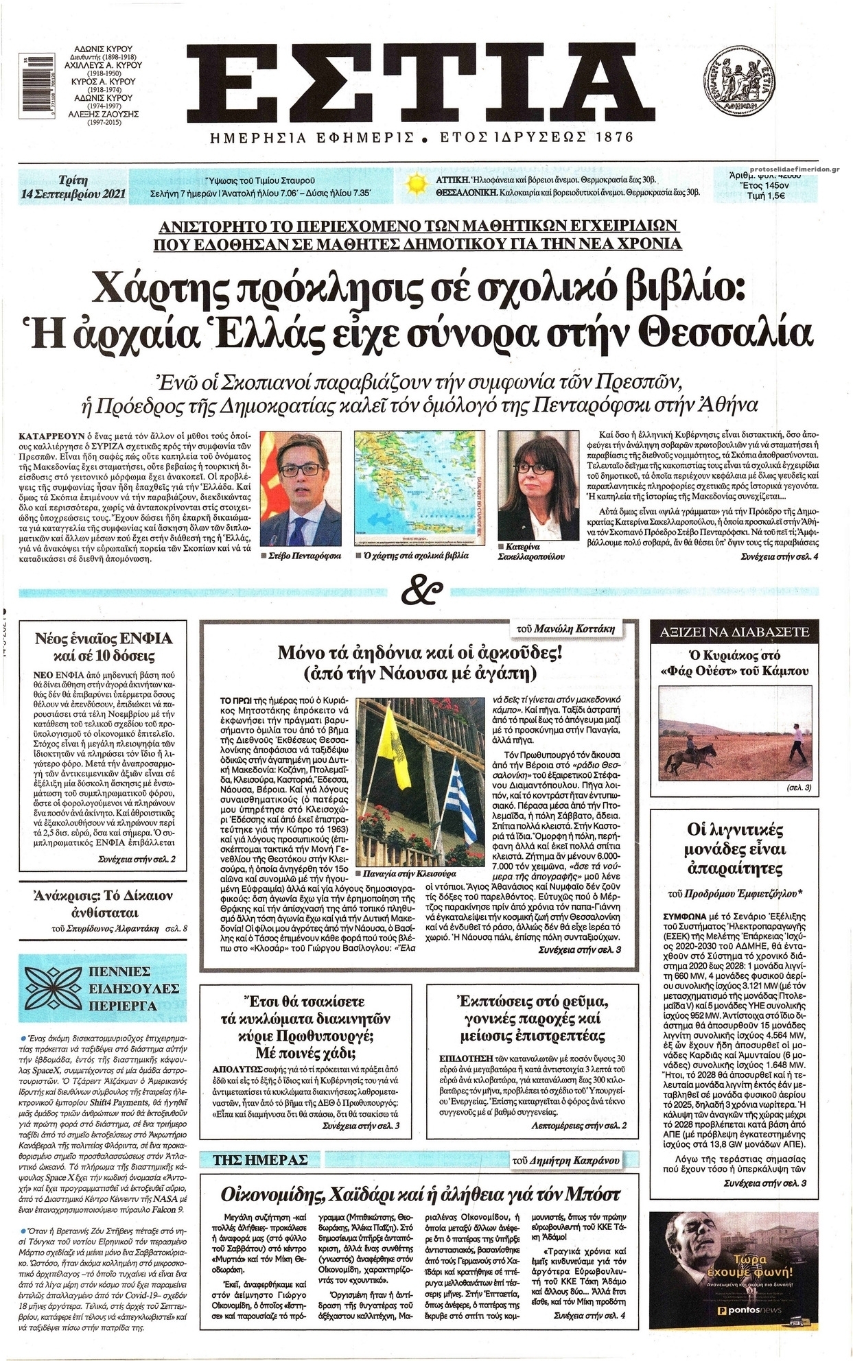 Σε αυτή τη σελίδα θα βρείτε το πρωτοσέλιδο της εφημερίδας Εστία που κυκλοφόρησε Τρίτη 14 Σεπτεμβρίου 2021. Για να διαβάσετε το πρωτοσέλιδο της εφημερίδας Εστία σε μεγαλύτερο μέγεθος κρατήστε το ποντίκι πατημένο πάνω στο μεγάλο πρωτοσέλιδο Εστία και σύρετε προς την κατέυθυνση που θέλετε. Για να δείτε το ιστορικό αρχείο της εφημερίδας Εστία πατήστε εδώ ή πατήστε από μενού "Αρχείο" και επιλέξτε από τη λίστα Εστία.