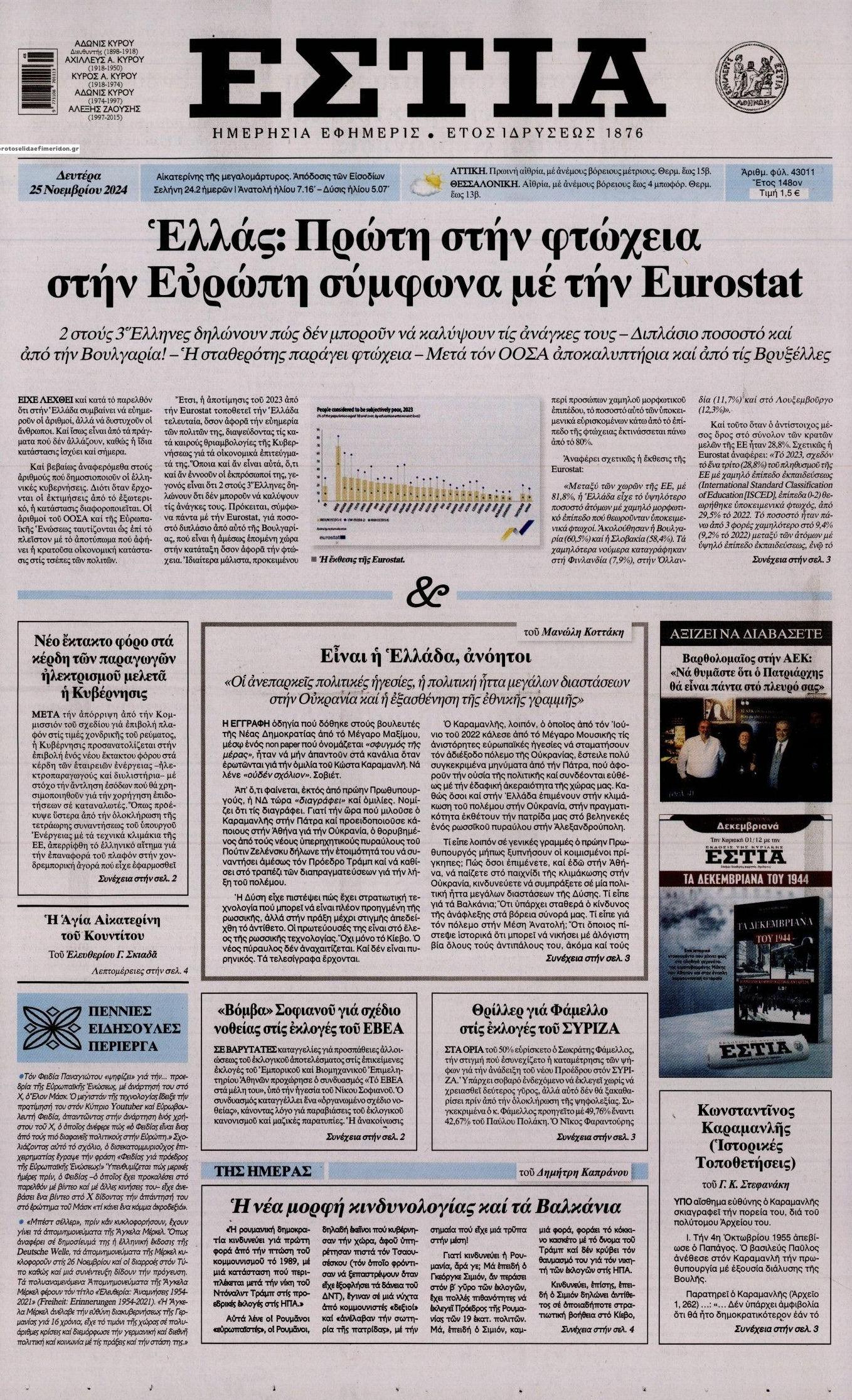 Διαβάστε το πρωτοσέλιδο της εφημερίδας Εστία