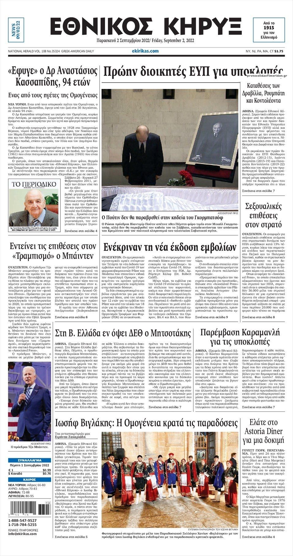 Σε αυτή τη σελίδα θα βρείτε το πρωτοσέλιδο της εφημερίδας Εθνικός Κήρυξ που κυκλοφόρησε Παρασκευή 2 Σεπτεμβρίου 2022. Για να διαβάσετε το πρωτοσέλιδο της εφημερίδας Εθνικός Κήρυξ σε μεγαλύτερο μέγεθος κρατήστε το ποντίκι πατημένο πάνω στο μεγάλο πρωτοσέλιδο Εθνικός Κήρυξ και σύρετε προς την κατέυθυνση που θέλετε. Για να δείτε το ιστορικό αρχείο της εφημερίδας Εθνικός Κήρυξ πατήστε εδώ ή πατήστε από μενού "Αρχείο" και επιλέξτε από τη λίστα Εθνικός Κήρυξ.