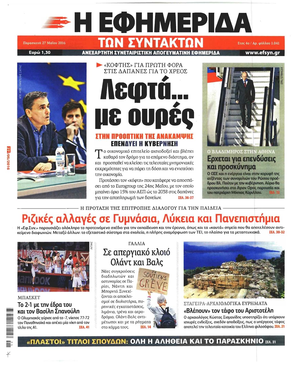 Σε αυτή τη σελίδα θα βρείτε το πρωτοσέλιδο της εφημερίδας Των συντακτών που κυκλοφόρησε Παρασκευή 27 Μαΐου 2016. Για να διαβάσετε το πρωτοσέλιδο της εφημερίδας Των συντακτών σε μεγαλύτερο μέγεθος κρατήστε το ποντίκι πατημένο πάνω στο μεγάλο πρωτοσέλιδο Των συντακτών και σύρετε προς την κατέυθυνση που θέλετε. Για να δείτε το ιστορικό αρχείο της εφημερίδας Των συντακτών πατήστε εδώ ή πατήστε από μενού "Αρχείο" και επιλέξτε από τη λίστα Των συντακτών.