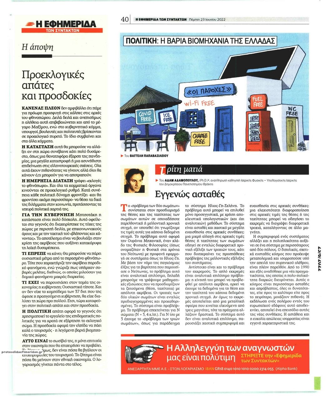 Διαβάστε το πρωτοσέλιδο της εφημερίδας Των συντακτών