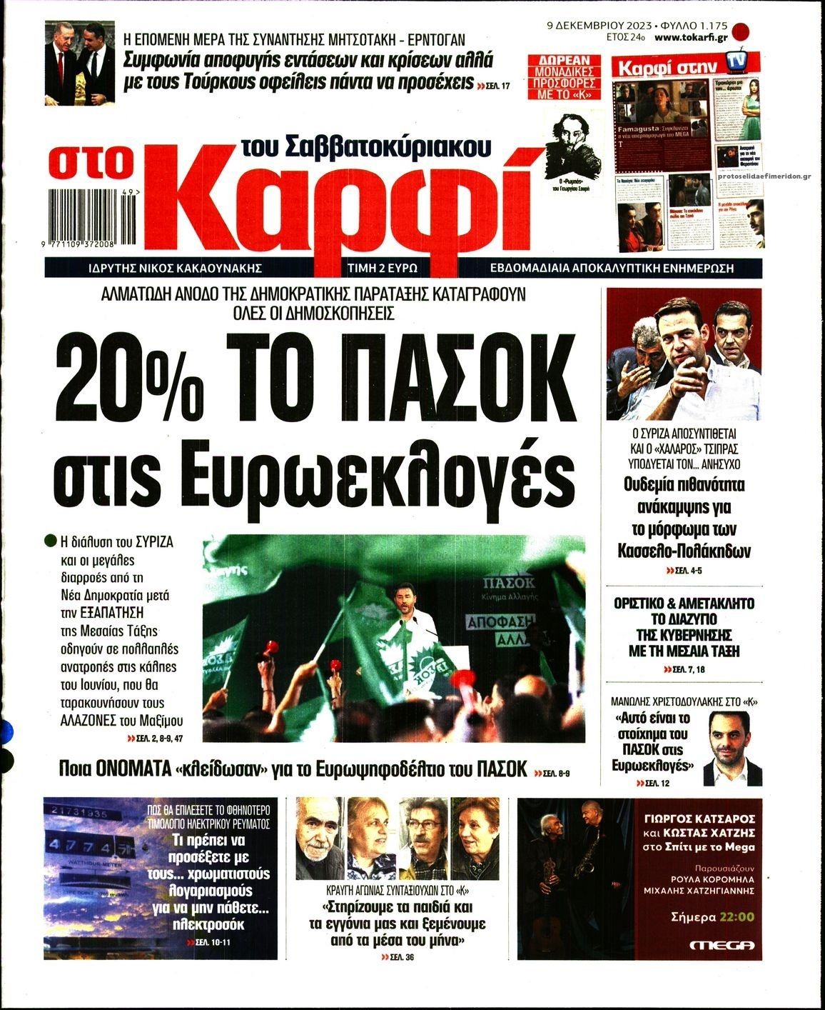 Σε αυτή τη σελίδα θα βρείτε το πρωτοσέλιδο της εφημερίδας Το Καρφί που κυκλοφόρησε Σάββατο 9 Δεκεμβρίου 2023. Για να διαβάσετε το πρωτοσέλιδο της εφημερίδας Το Καρφί σε μεγαλύτερο μέγεθος κρατήστε το ποντίκι πατημένο πάνω στο μεγάλο πρωτοσέλιδο Το Καρφί και σύρετε προς την κατέυθυνση που θέλετε. Για να δείτε το ιστορικό αρχείο της εφημερίδας Το Καρφί πατήστε εδώ ή πατήστε από μενού "Αρχείο" και επιλέξτε από τη λίστα Το Καρφί.