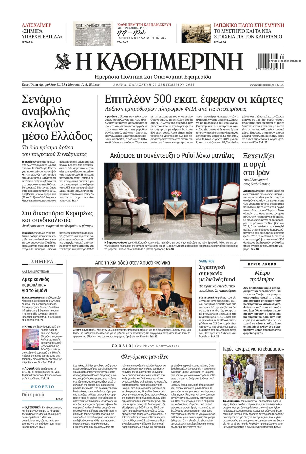 Σε αυτή τη σελίδα θα βρείτε το πρωτοσέλιδο της εφημερίδας Καθημερινή που κυκλοφόρησε Παρασκευή 23 Σεπτεμβρίου 2022. Για να διαβάσετε το πρωτοσέλιδο της εφημερίδας Καθημερινή σε μεγαλύτερο μέγεθος κρατήστε το ποντίκι πατημένο πάνω στο μεγάλο πρωτοσέλιδο Καθημερινή και σύρετε προς την κατέυθυνση που θέλετε. Για να δείτε το ιστορικό αρχείο της εφημερίδας Καθημερινή πατήστε εδώ ή πατήστε από μενού "Αρχείο" και επιλέξτε από τη λίστα Καθημερινή.