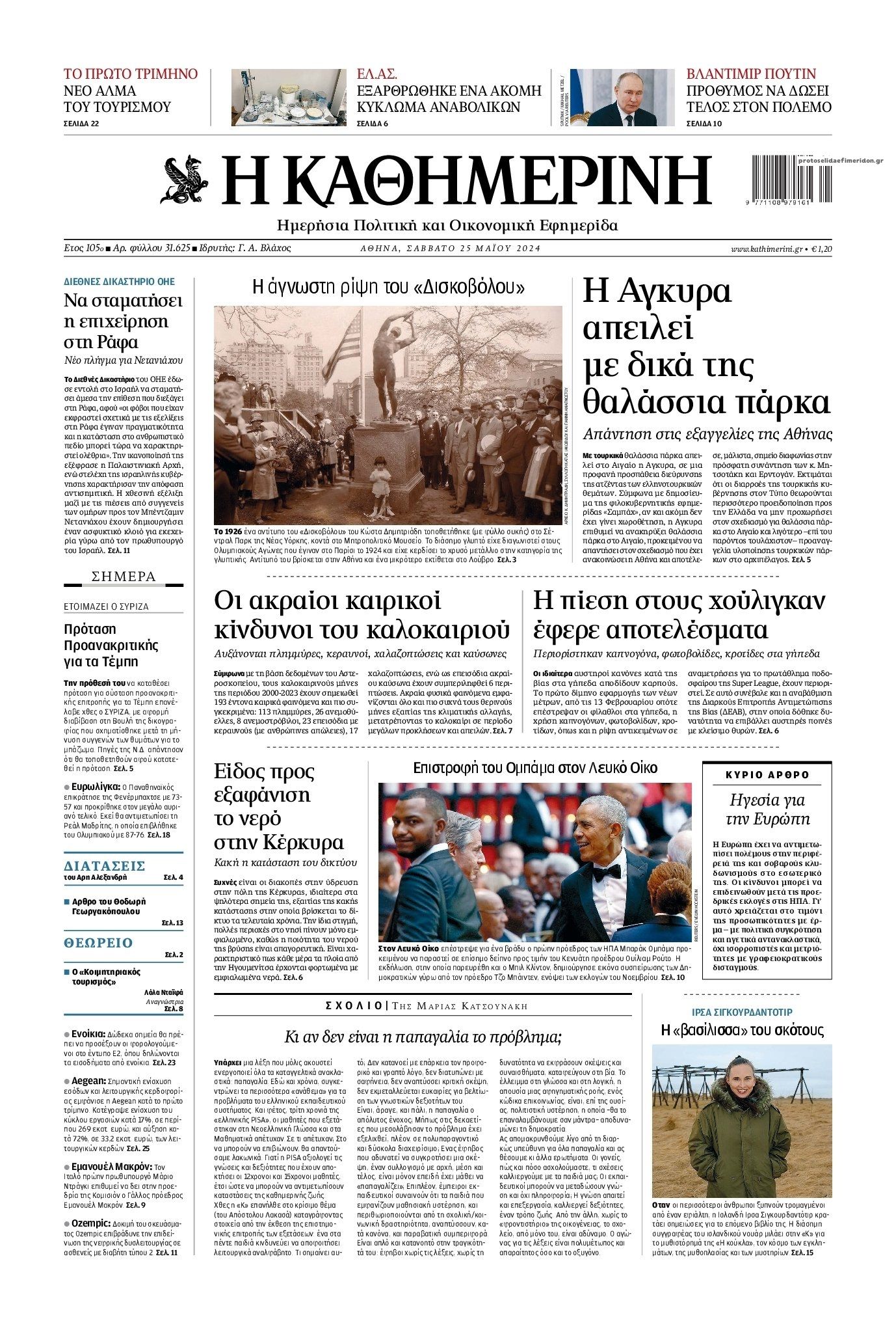 Σε αυτή τη σελίδα θα βρείτε το πρωτοσέλιδο της εφημερίδας Καθημερινή που κυκλοφόρησε Σάββατο 25 Μαΐου 2024. Για να διαβάσετε το πρωτοσέλιδο της εφημερίδας Καθημερινή σε μεγαλύτερο μέγεθος κρατήστε το ποντίκι πατημένο πάνω στο μεγάλο πρωτοσέλιδο Καθημερινή και σύρετε προς την κατέυθυνση που θέλετε. Για να δείτε το ιστορικό αρχείο της εφημερίδας Καθημερινή πατήστε εδώ ή πατήστε από μενού "Αρχείο" και επιλέξτε από τη λίστα Καθημερινή.