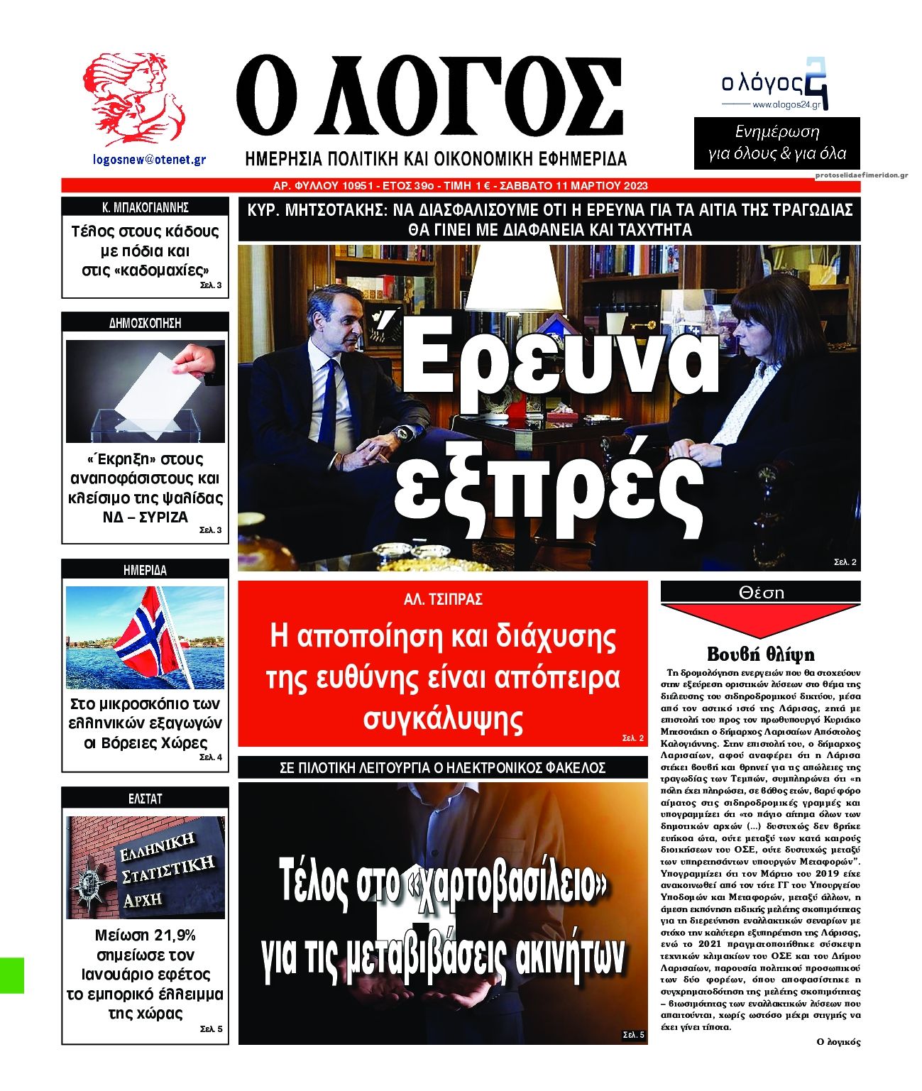 Διαβάστε το πρωτοσέλιδο της εφημερίδας Λόγος
