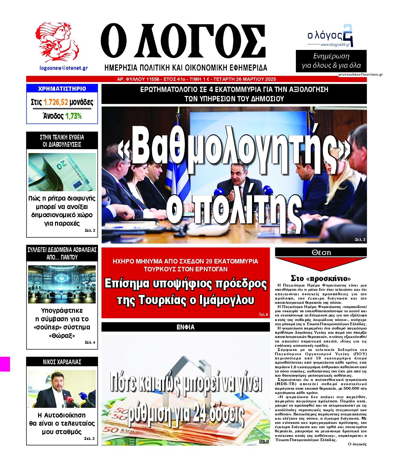 Διαβάστε το πρωτοσέλιδο της εφημερίδας Λόγος