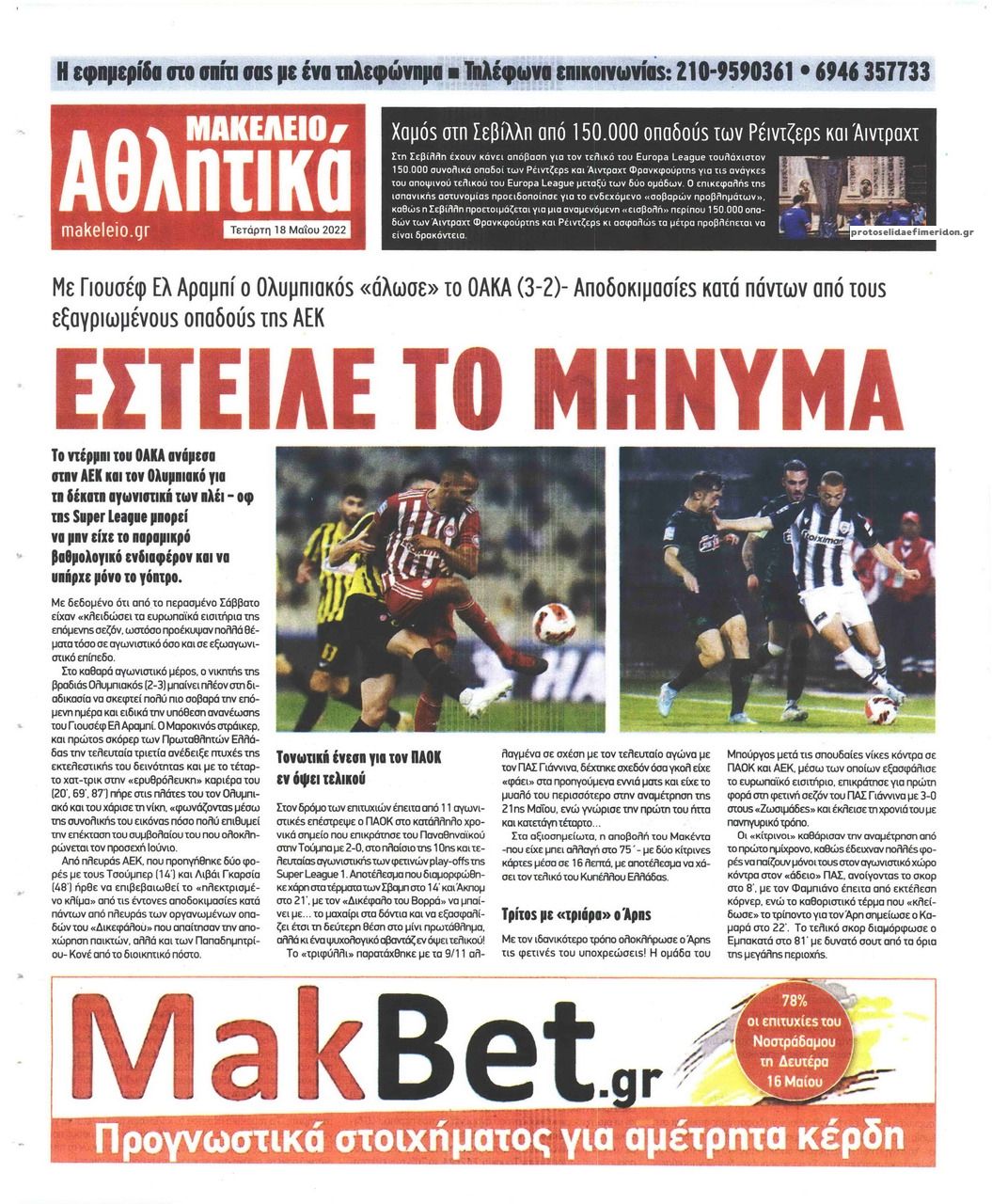 Σε αυτή τη σελίδα θα βρείτε το πρωτοσέλιδο της εφημερίδας Μακελειό που κυκλοφόρησε Τετάρτη 18 Μαΐου 2022. Για να διαβάσετε το πρωτοσέλιδο της εφημερίδας Μακελειό σε μεγαλύτερο μέγεθος κρατήστε το ποντίκι πατημένο πάνω στο μεγάλο πρωτοσέλιδο Μακελειό και σύρετε προς την κατέυθυνση που θέλετε. Για να δείτε το ιστορικό αρχείο της εφημερίδας Μακελειό πατήστε εδώ ή πατήστε από μενού "Αρχείο" και επιλέξτε από τη λίστα Μακελειό.