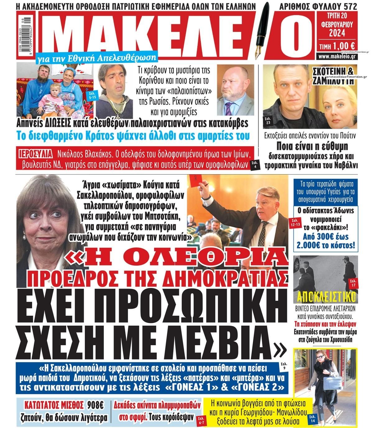Σε αυτή τη σελίδα θα βρείτε το πρωτοσέλιδο της εφημερίδας Μακελειό που κυκλοφόρησε Τρίτη 20 Φεβρουαρίου 2024. Για να διαβάσετε το πρωτοσέλιδο της εφημερίδας Μακελειό σε μεγαλύτερο μέγεθος κρατήστε το ποντίκι πατημένο πάνω στο μεγάλο πρωτοσέλιδο Μακελειό και σύρετε προς την κατέυθυνση που θέλετε. Για να δείτε το ιστορικό αρχείο της εφημερίδας Μακελειό πατήστε εδώ ή πατήστε από μενού "Αρχείο" και επιλέξτε από τη λίστα Μακελειό.