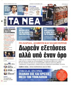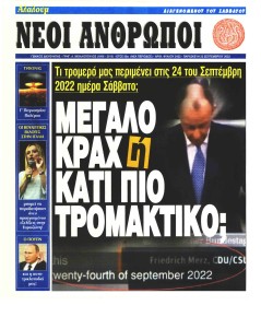 Σε αυτή τη σελίδα θα βρείτε το πρωτοσέλιδο της εφημερίδας Νέοι Άνθρωποι που κυκλοφόρησε Παρασκευή 23 Σεπτεμβρίου 2022. Για να διαβάσετε το πρωτοσέλιδο της εφημερίδας Νέοι Άνθρωποι σε μεγαλύτερο μέγεθος κρατήστε το ποντίκι πατημένο πάνω στο μεγάλο πρωτοσέλιδο Νέοι Άνθρωποι και σύρετε προς την κατέυθυνση που θέλετε. Για να δείτε το ιστορικό αρχείο της εφημερίδας Νέοι Άνθρωποι πατήστε εδώ ή πατήστε από μενού "Αρχείο" και επιλέξτε από τη λίστα Νέοι Άνθρωποι.