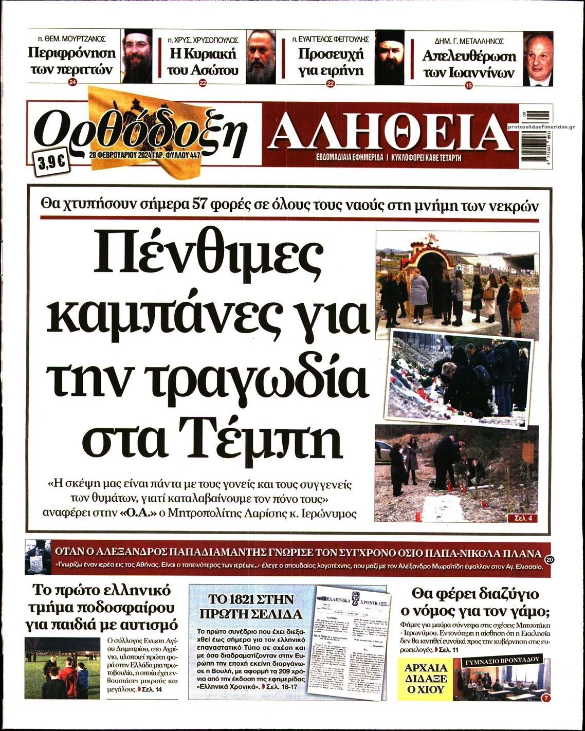 Διαβάστε το πρωτοσέλιδο της εφημερίδας Ορθόδοξη Αλήθεια