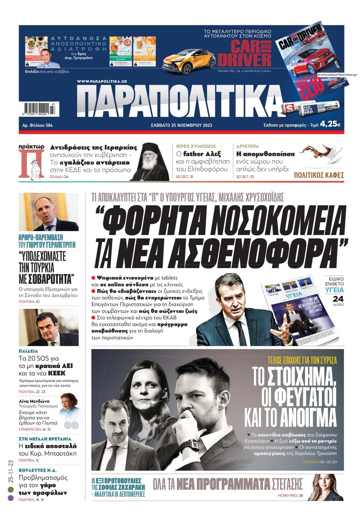 Σε αυτή τη σελίδα θα βρείτε το πρωτοσέλιδο της εφημερίδας Παραπολιτικά που κυκλοφόρησε Σάββατο 25 Νοεμβρίου 2023. Για να διαβάσετε το πρωτοσέλιδο της εφημερίδας Παραπολιτικά σε μεγαλύτερο μέγεθος κρατήστε το ποντίκι πατημένο πάνω στο μεγάλο πρωτοσέλιδο Παραπολιτικά και σύρετε προς την κατέυθυνση που θέλετε. Για να δείτε το ιστορικό αρχείο της εφημερίδας Παραπολιτικά πατήστε εδώ ή πατήστε από μενού "Αρχείο" και επιλέξτε από τη λίστα Παραπολιτικά.