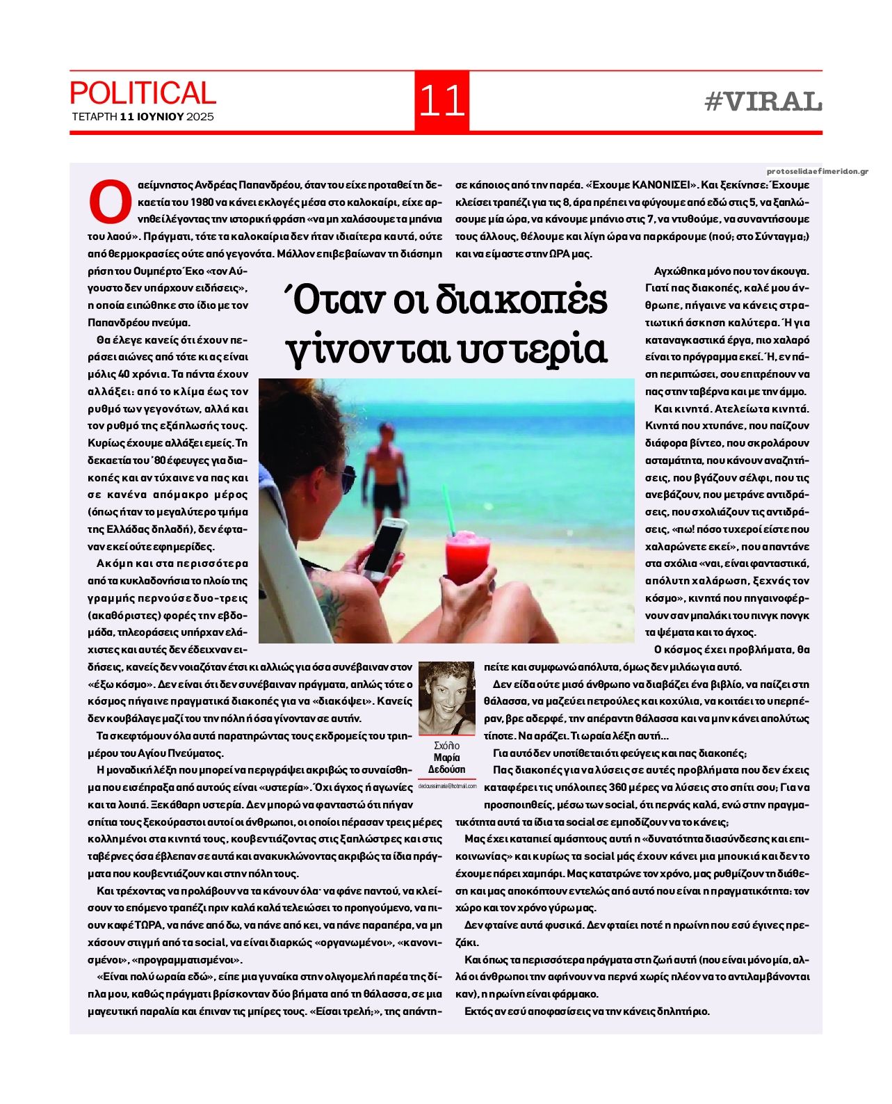 Σε αυτή τη σελίδα θα βρείτε το πρωτοσέλιδο της εφημερίδας Political που κυκλοφόρησε Τετάρτη 11 Ιουνίου 2025. Για να διαβάσετε το πρωτοσέλιδο της εφημερίδας Political σε μεγαλύτερο μέγεθος κρατήστε το ποντίκι πατημένο πάνω στο μεγάλο πρωτοσέλιδο Political και σύρετε προς την κατέυθυνση που θέλετε. Για να δείτε το ιστορικό αρχείο της εφημερίδας Political πατήστε εδώ ή πατήστε από μενού "Αρχείο" και επιλέξτε από τη λίστα Political.