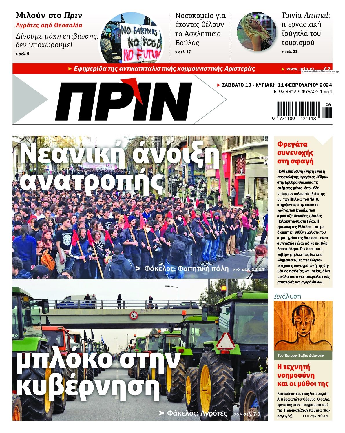 Σε αυτή τη σελίδα θα βρείτε το πρωτοσέλιδο της εφημερίδας Πριν που κυκλοφόρησε Σάββατο 10 Φεβρουαρίου 2024. Για να διαβάσετε το πρωτοσέλιδο της εφημερίδας Πριν σε μεγαλύτερο μέγεθος κρατήστε το ποντίκι πατημένο πάνω στο μεγάλο πρωτοσέλιδο Πριν και σύρετε προς την κατέυθυνση που θέλετε. Για να δείτε το ιστορικό αρχείο της εφημερίδας Πριν πατήστε εδώ ή πατήστε από μενού "Αρχείο" και επιλέξτε από τη λίστα Πριν.