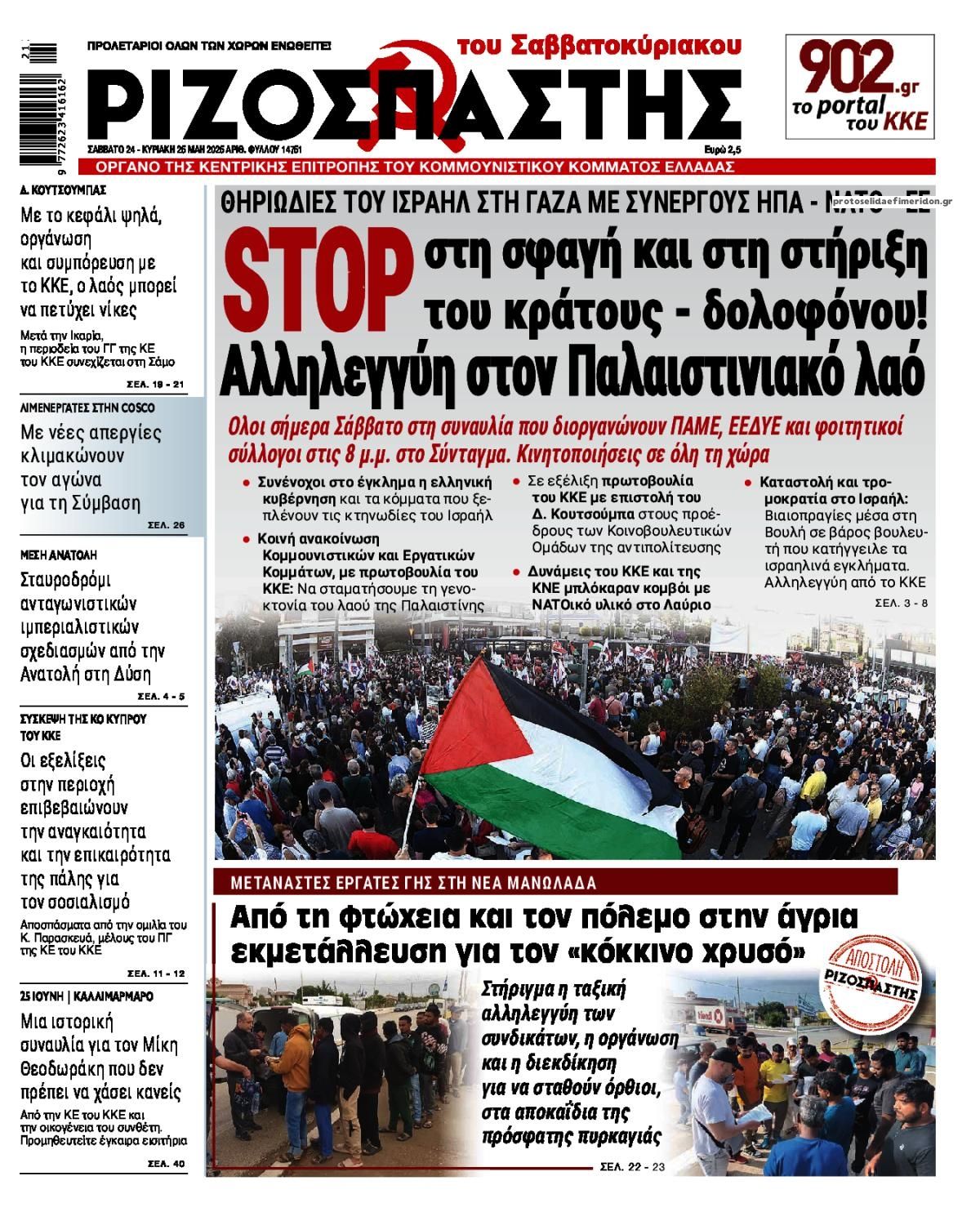 Σε αυτή τη σελίδα θα βρείτε το πρωτοσέλιδο της εφημερίδας Ριζοσπάστης που κυκλοφόρησε Σάββατο 24 Μαΐου 2025. Για να διαβάσετε το πρωτοσέλιδο της εφημερίδας Ριζοσπάστης σε μεγαλύτερο μέγεθος κρατήστε το ποντίκι πατημένο πάνω στο μεγάλο πρωτοσέλιδο Ριζοσπάστης και σύρετε προς την κατέυθυνση που θέλετε. Για να δείτε το ιστορικό αρχείο της εφημερίδας Ριζοσπάστης πατήστε εδώ ή πατήστε από μενού "Αρχείο" και επιλέξτε από τη λίστα Ριζοσπάστης.