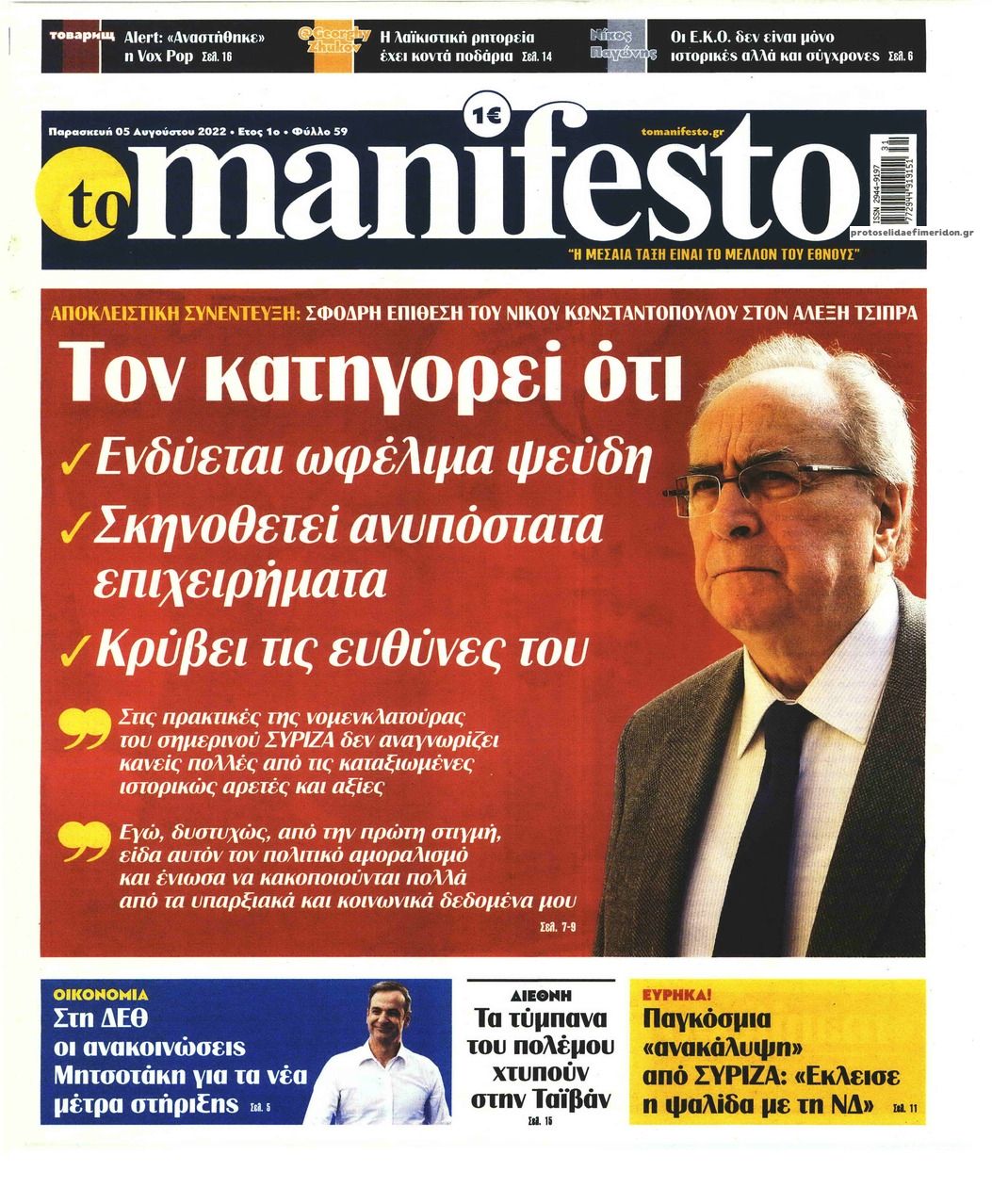 Διαβάστε το πρωτοσέλιδο της εφημερίδας Το Manifesto