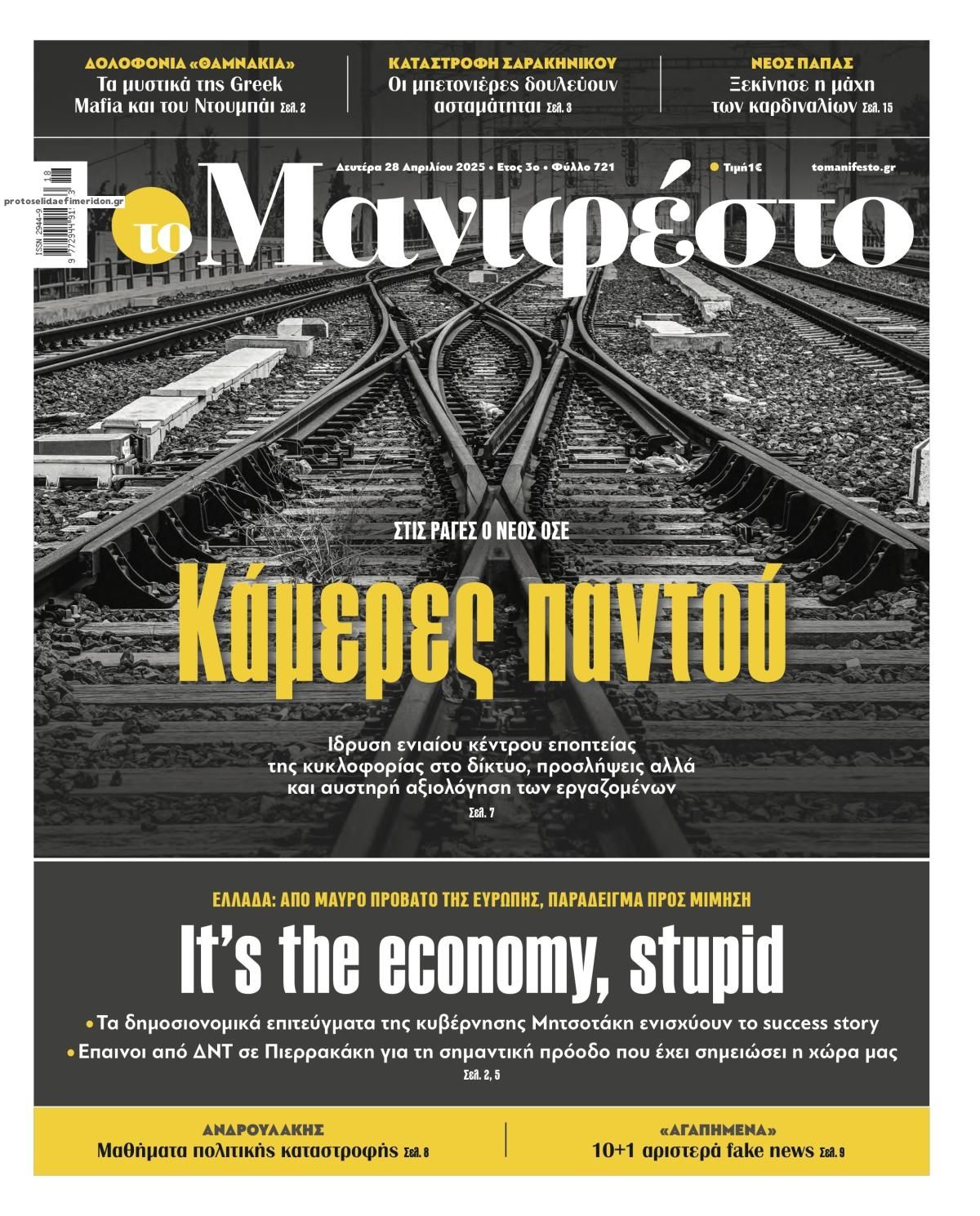 Σε αυτή τη σελίδα θα βρείτε το πρωτοσέλιδο της εφημερίδας Το Manifesto που κυκλοφόρησε Δευτέρα 28 Απριλίου 2025. Για να διαβάσετε το πρωτοσέλιδο της εφημερίδας Το Manifesto σε μεγαλύτερο μέγεθος κρατήστε το ποντίκι πατημένο πάνω στο μεγάλο πρωτοσέλιδο Το Manifesto και σύρετε προς την κατέυθυνση που θέλετε. Για να δείτε το ιστορικό αρχείο της εφημερίδας Το Manifesto πατήστε εδώ ή πατήστε από μενού "Αρχείο" και επιλέξτε από τη λίστα Το Manifesto.