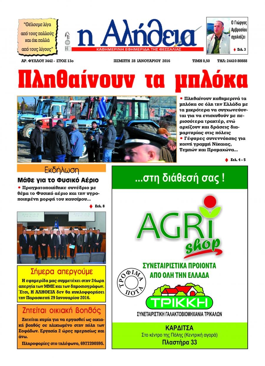 Διαβάστε το πρωτοσέλιδο της εφημερίδας Αλήθεια της Καρδίτσας