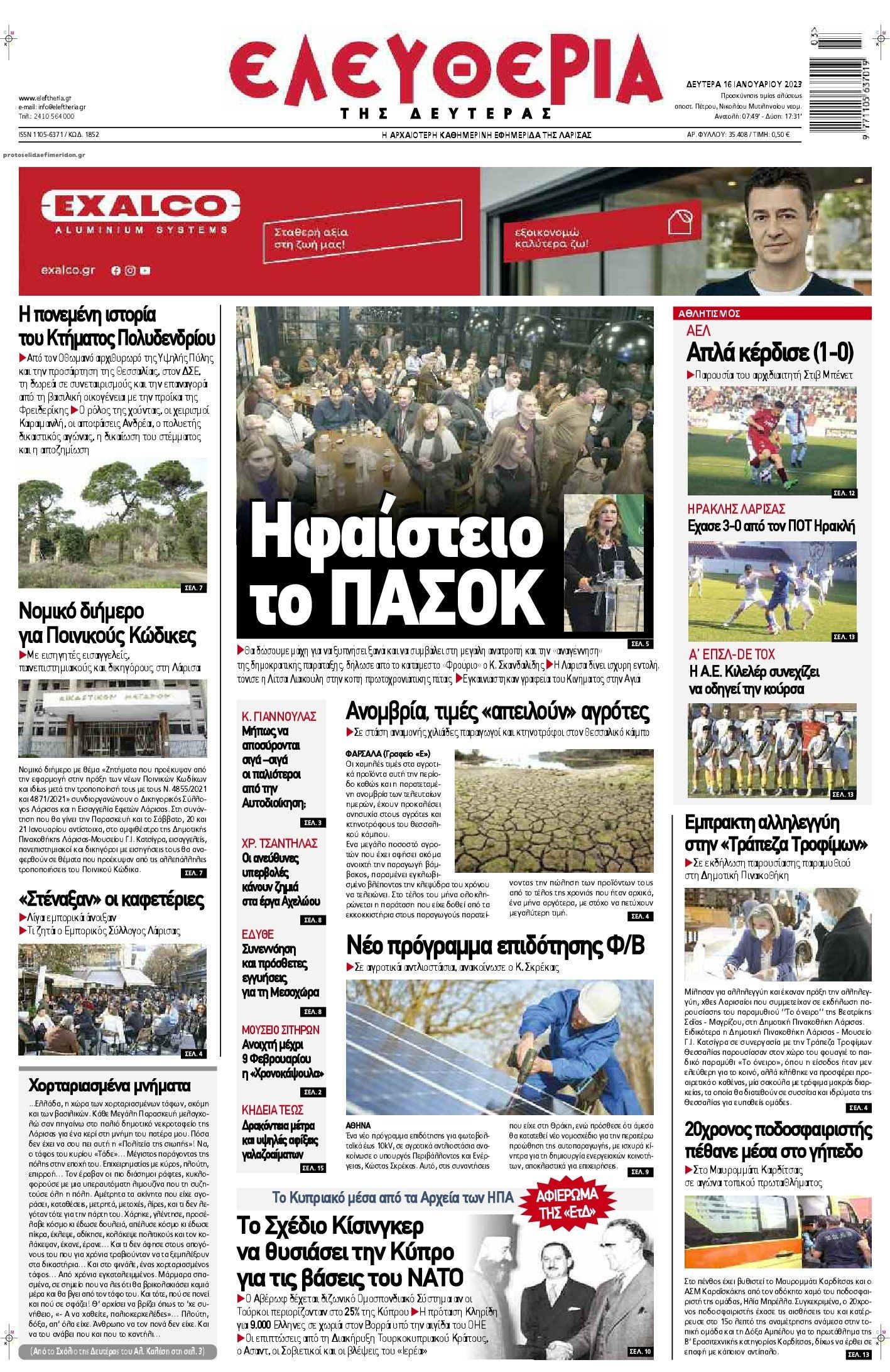 Διαβάστε το πρωτοσέλιδο της εφημερίδας Ελευθερία Λάρισσας